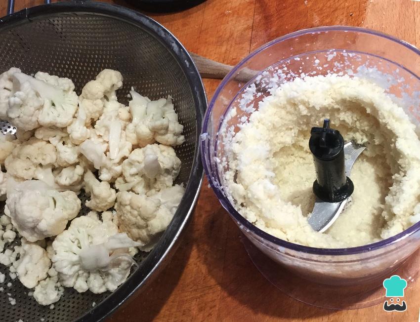 Mientras se hornea la coliflor, pon a cocer la quinoa en abundante agua durante unos 10 minutos, escurre bien y reserva. Cuando la coliflor esté hecha, ponla en la picadora y empieza a picar hasta conseguir una textura parecida a la de la quinoa. Añade el diente de ajo junto con los tomates secos cortados por la mitad que anteriormente habrás puesto en remojo.