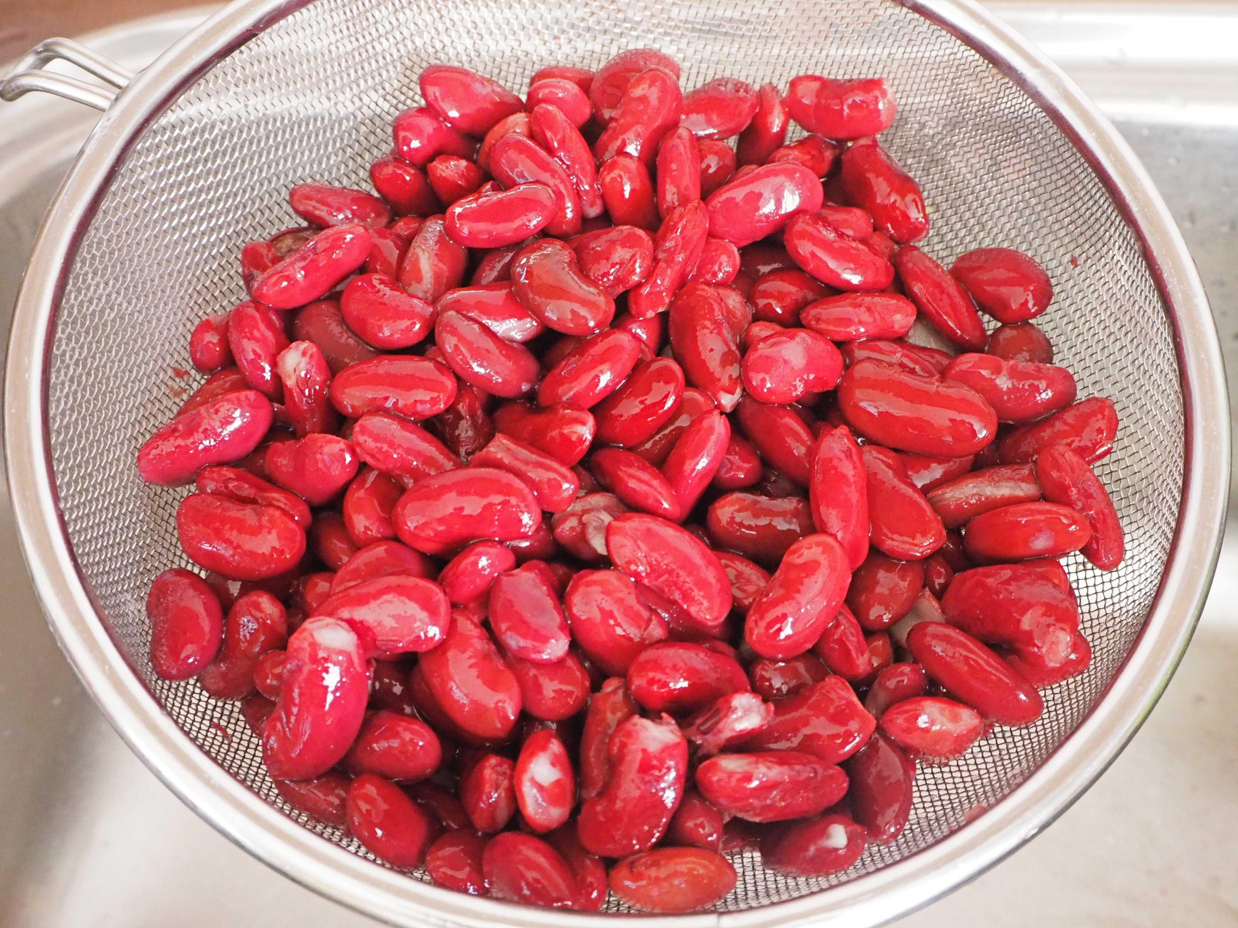 Lavamos con agua las judías rojas para quitar el líquido de conserva y las escurrimos bien.