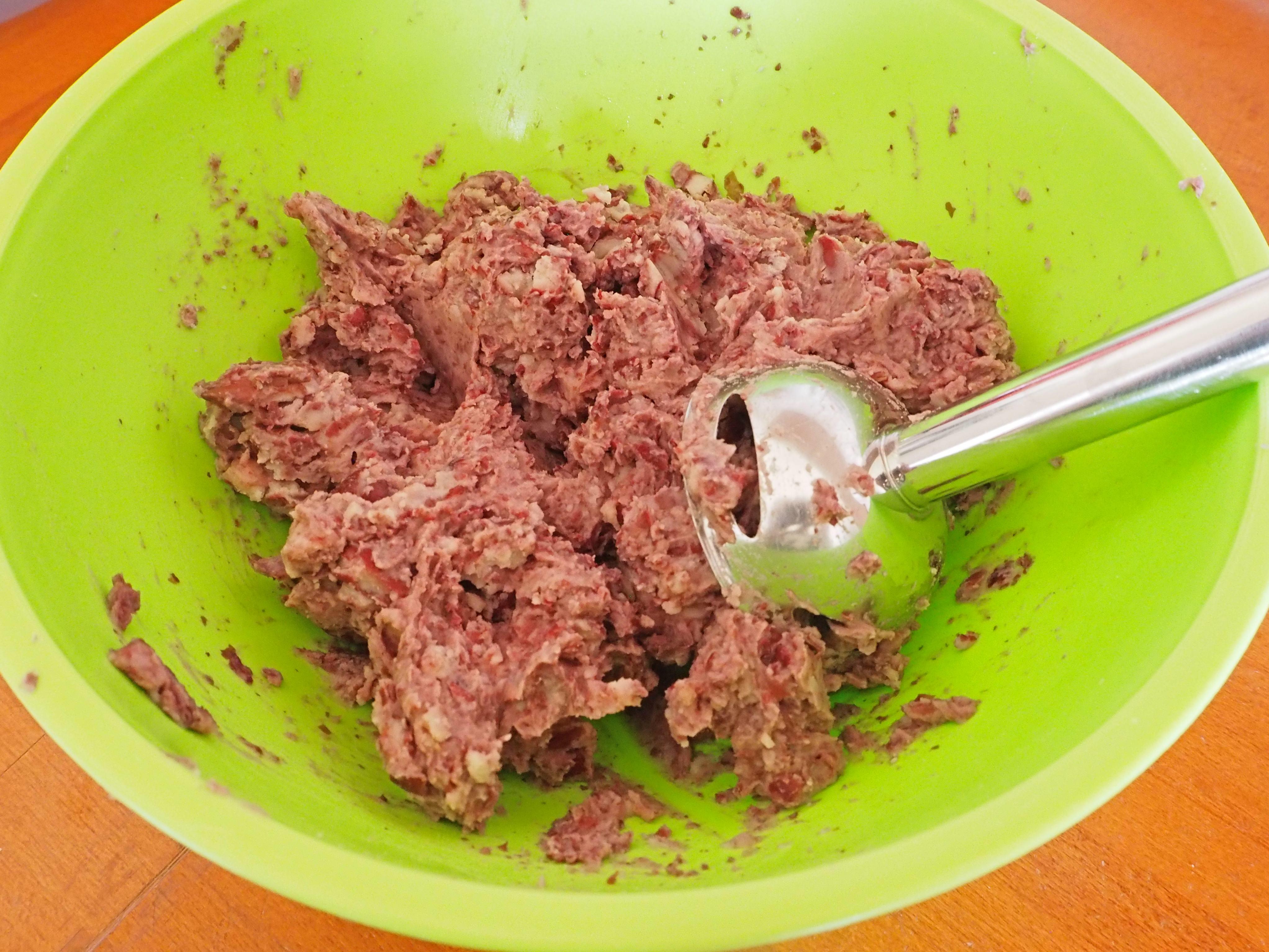 Cuando tengamos listas las judías, las ponemos en un bol y añadimos el resto de ingredientes, incluido el huevo vegano. Vamos mezclando (lo mejor es hacerlo con las manos), hasta obtener una pasta homogénea.