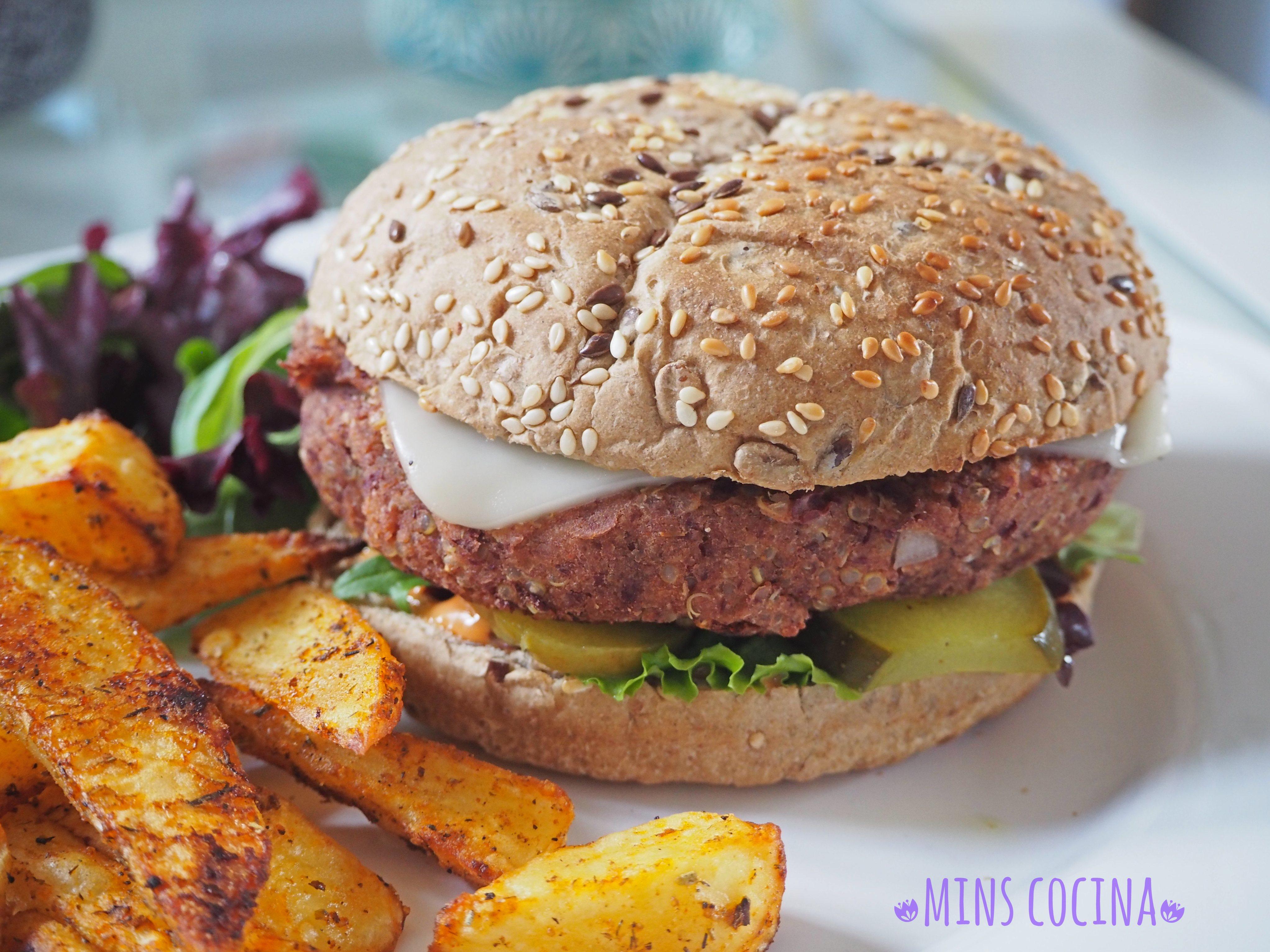 Ya solo queda montar nuestra hamburguesa de quinoa y judías rojas. Para ello, yo tosté un poco de pan rústico de hamburguesa con semillas (¡ñam!), coloqué unas hojas de lechugas variadas, una rodaja de tomate y otra de pepinillo en vinagre, luego la hamburguesa con la loncha de queso y encima un poco de las salsa especial para hamburguesa vegana.