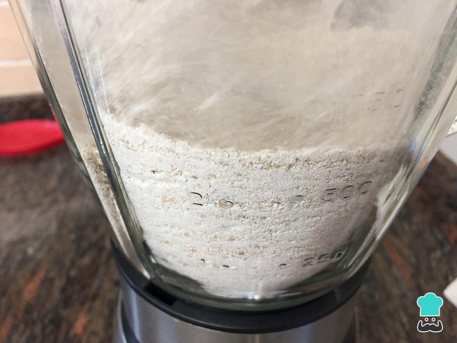 Pasados unos tres minutos, remueve la avena para que los copos se trituren de forma pareja y sigue triturando. Aunque pueda parecer un paso que puedas saltarle, lo cierto es que si no remueves la avena lo que sucederá es que muchos de los copos se quedarán sin triturar porque la harina se acumulará en el fondo y no permitirá que circulen los copos restantes.