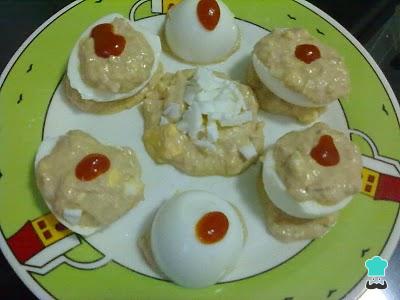 Cocer los huevos en agua hirviendo durante 10 minutos. Sumergirlos con agua fría y pelarlos. Cortar un trozo de clara del lado más grueso para que se aguanten derechos.
