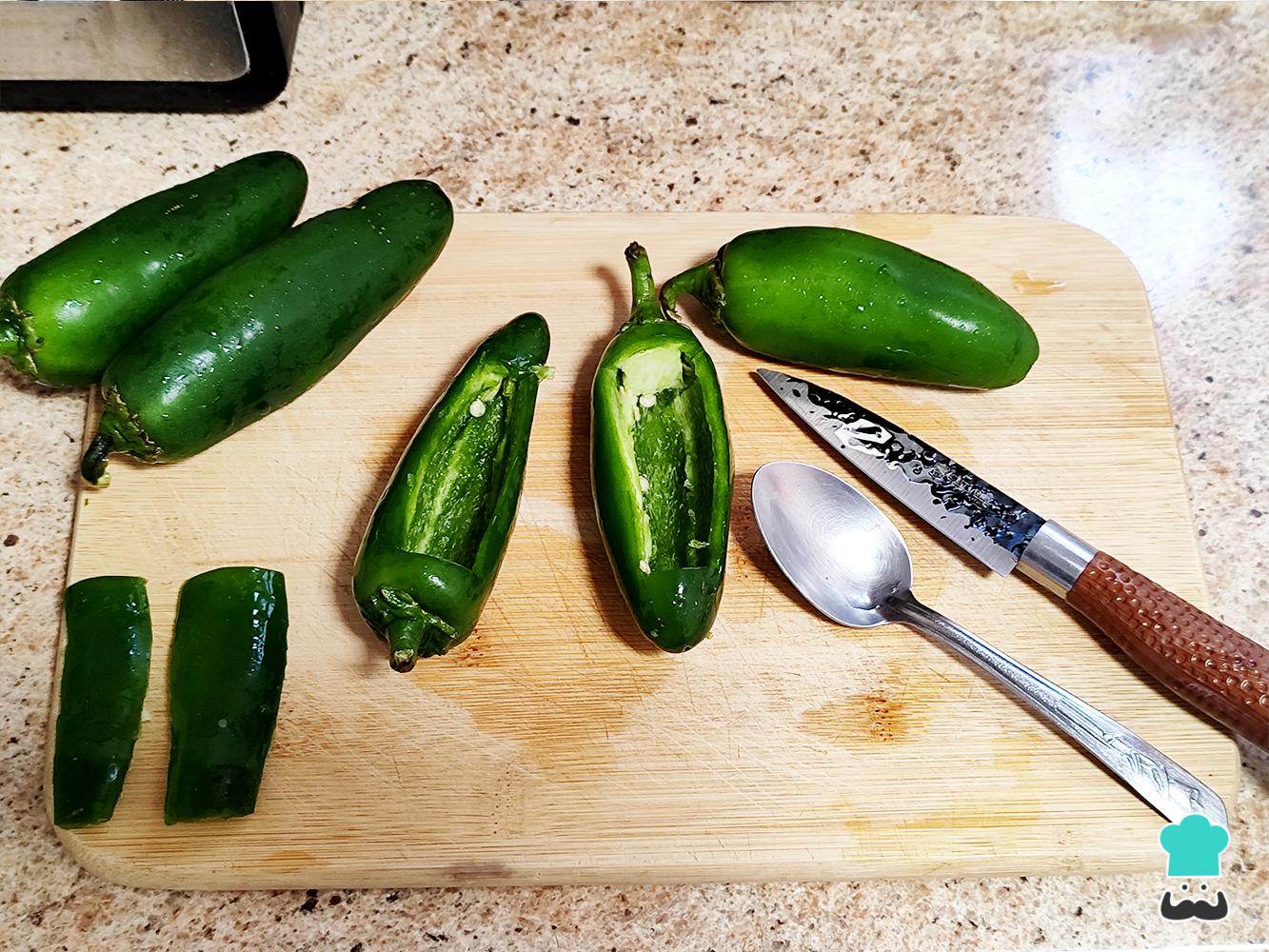 Para empezar la receta, limpia los jalapeños yhaz un corte longitudinal sin llegar a los extremos, retira cuidadosamente las semillas con auda de una cuchara.