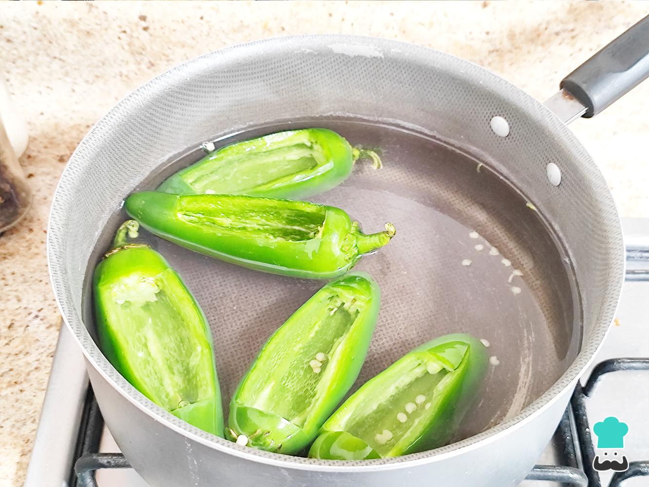 Cuece los chiles jalapeños en agua hirviendo con sal durante 3 minutos. Escúrrelos y deja enfriar. Con este paso se suavizarán y se reducirá ligeramente el picor de los chiles.