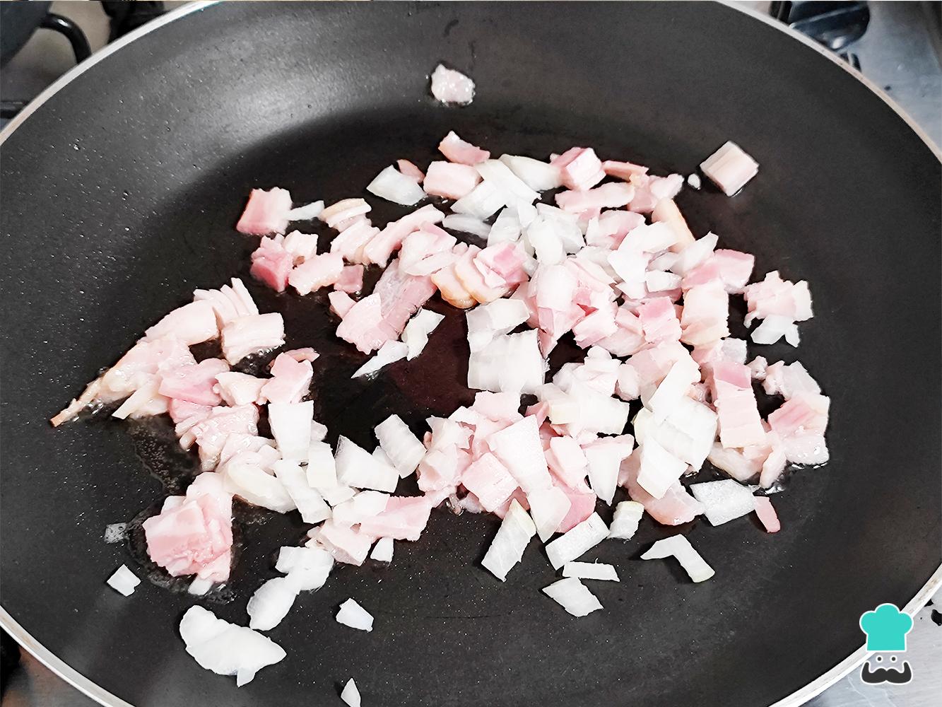 Fríe el tocino en una sartén sin aceite hasta que esté bien dorado, añade la cebolla y el ajo picados y mezcla para integrar.