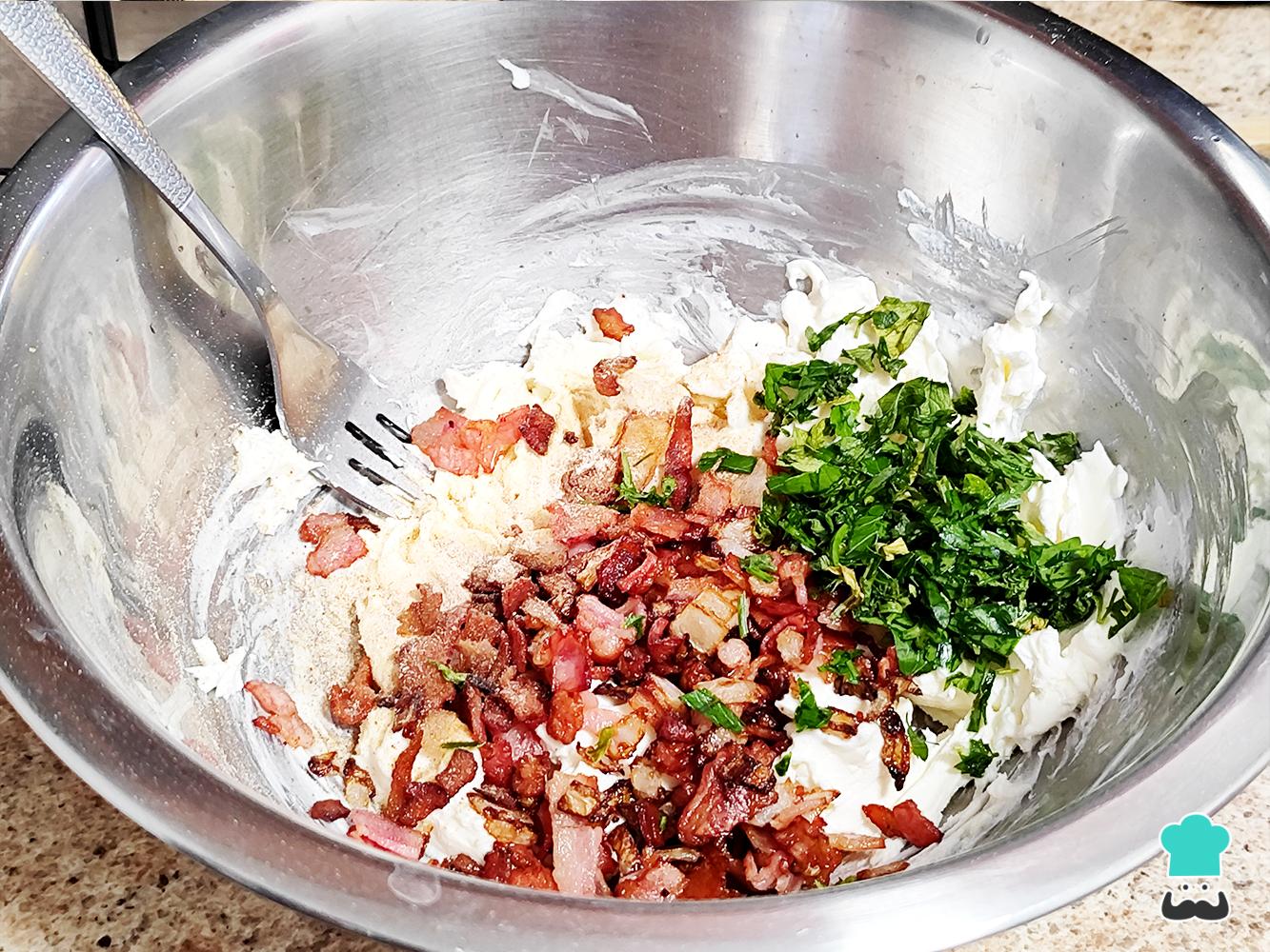Ahora prepara el relleno. Mezcla el queso crema con el tocino, la cebolla y el ajo. Salpimenta al gusto y mezcla hasta que se integre todo por completo.