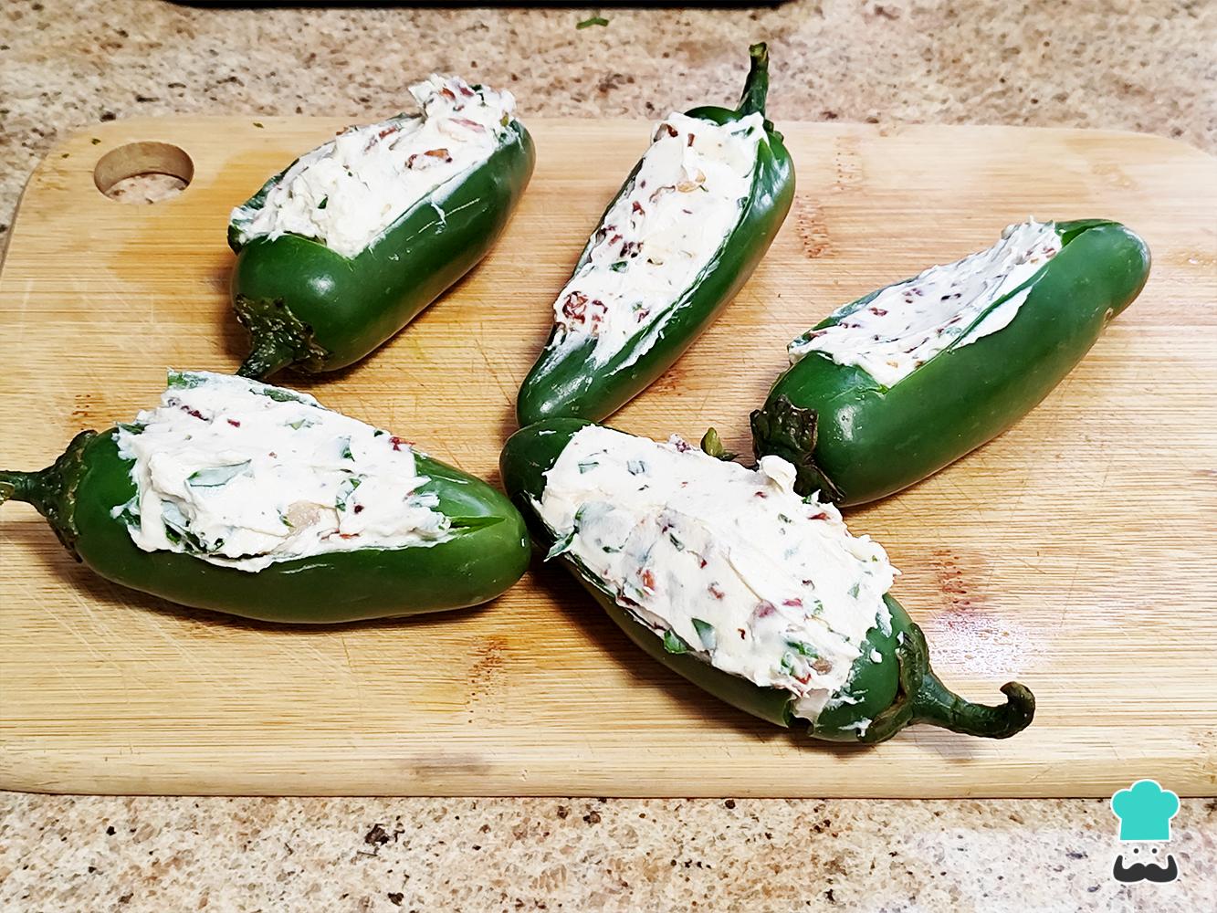 Rellena los jalapeños con la mezcla de queso y tocino, distribuye bien y presiona suavemente para que queden bien rellenos.