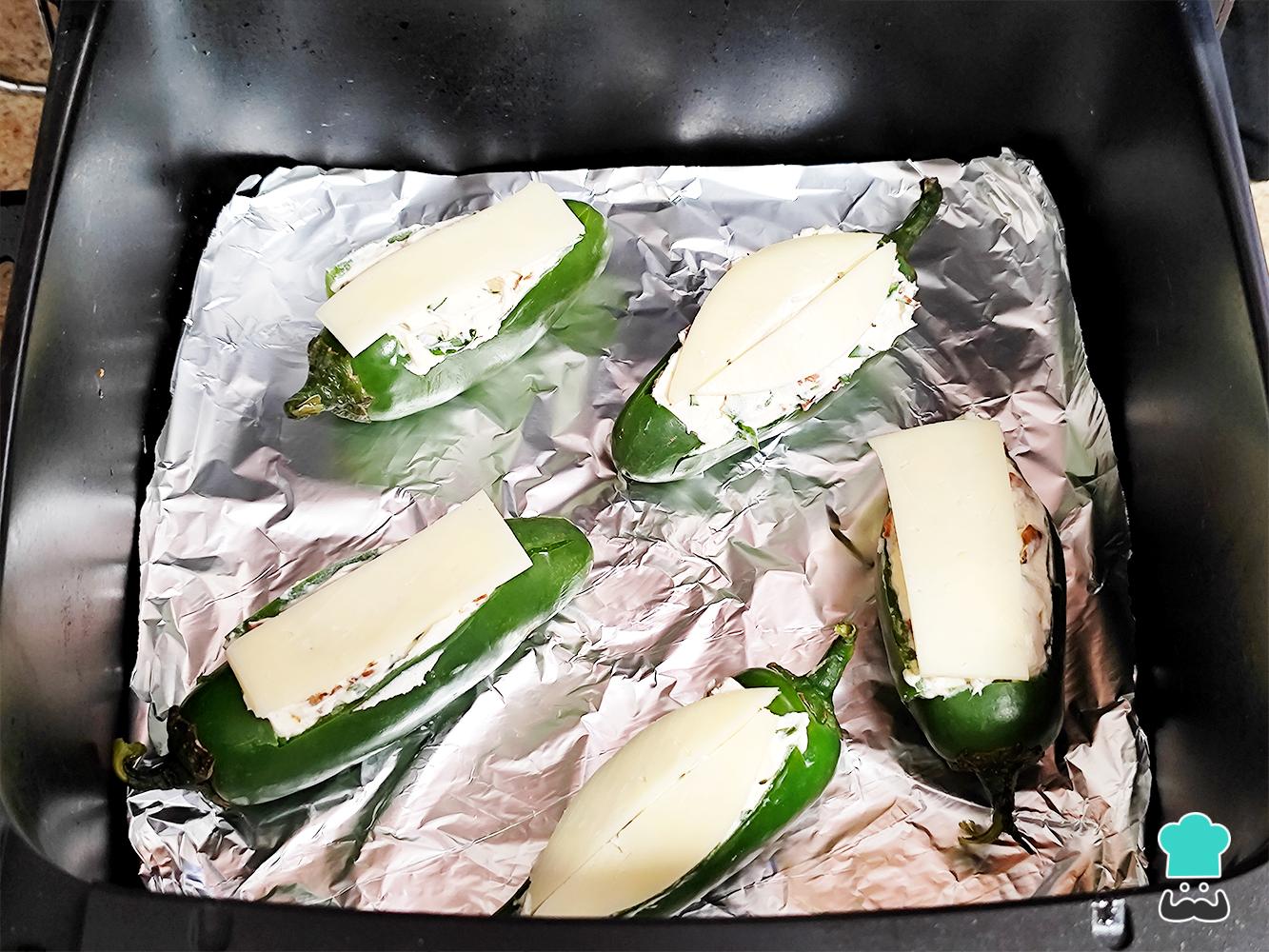 Cuando estén rellenos los chiles, coloca una porción de queso para gratinar y enseguida hornea a 180 °C durante 10 minutos, o hasta que el queso haya gratinado y esté dorado.