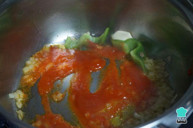 Añade en remojo las judías durante 12 horas. A continuación, en una cazuela pon un chorro de aceite de oliva a fuego medio, pica la cebolla muy pequeñita y añade a pochar en la cazuela. A medio pochar añade el pimiento verde, los ajos pelados enteros y el tomate frito. Mezcla y deja 3-4 minutos que se cocine a fuego medio.
