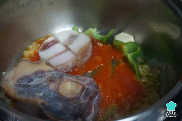 Añade el hueso de jamón, la panceta salada y el chorizo en trozos.