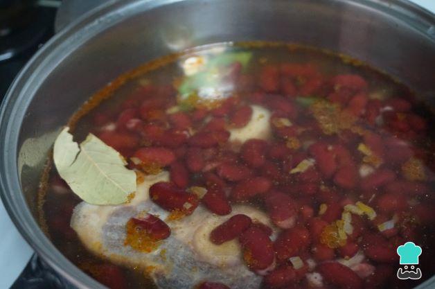 Cubre con agua fría y añade las judías pintas y una hoja de laurel. Deja que se cocine a fuego lento unas 2 horas o hasta que las judías pintas queden tiernas. A media cocción añade un poco de sal. Puede tardar más o menos según el tipo de judía, algunas necesitan menos tiempo.