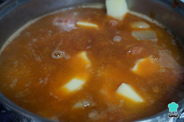 Pela y lava las patatas, córtalas en trozos chascándolas al final del corte para que suelten el almidón y así espese un poco el caldo. Deja que se cueza todo hasta que estén las patatas.