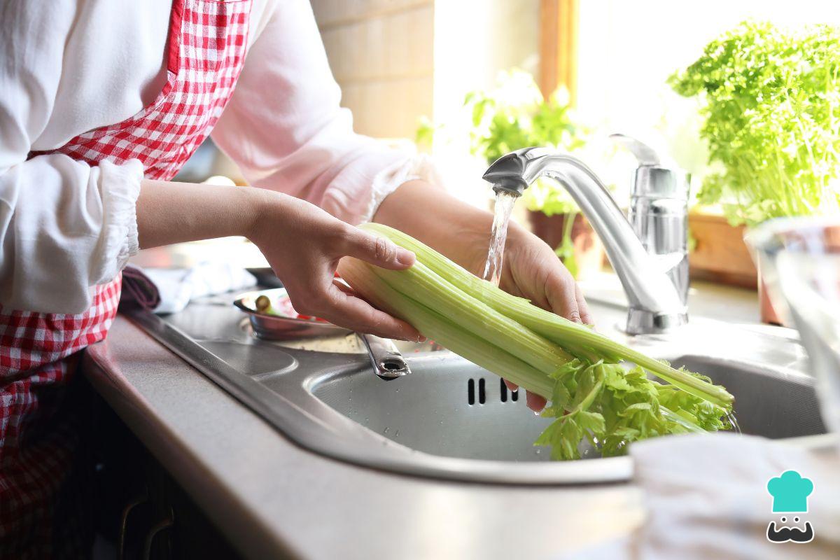 Lava el apio y corta los tallos en trozos más pequeños para poder licuar mejor a continuación.
