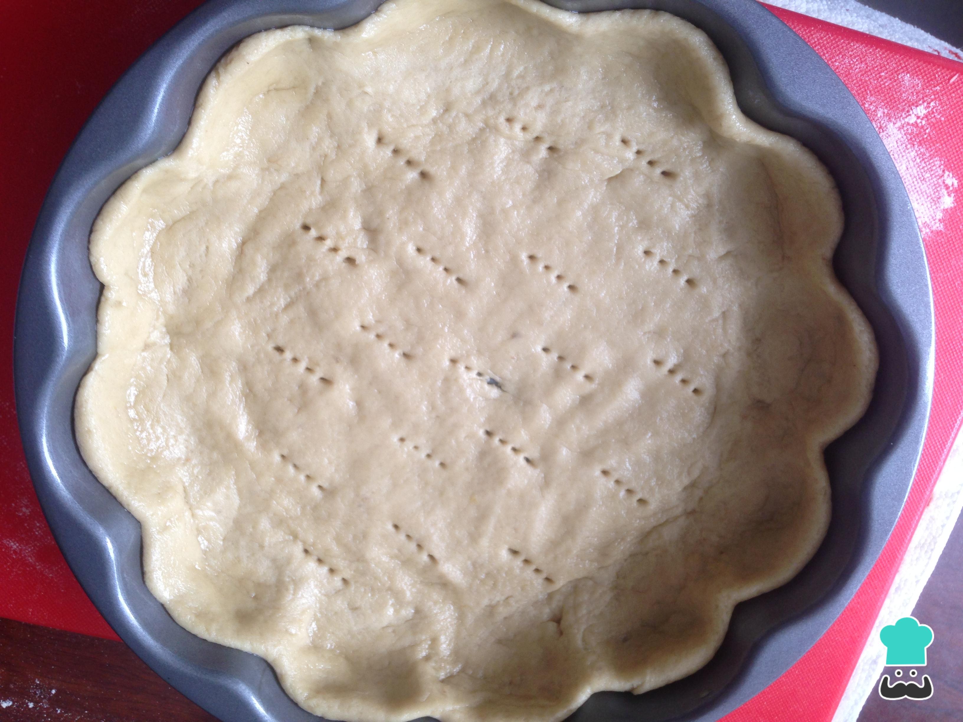 Engrasa un molde de unos 25 centímetros y extiende la masa hasta cubrir los bordes. Perfora el fondo de la masa para que no se infle en el horno. Hornea por 15 minutos y deja reposar.