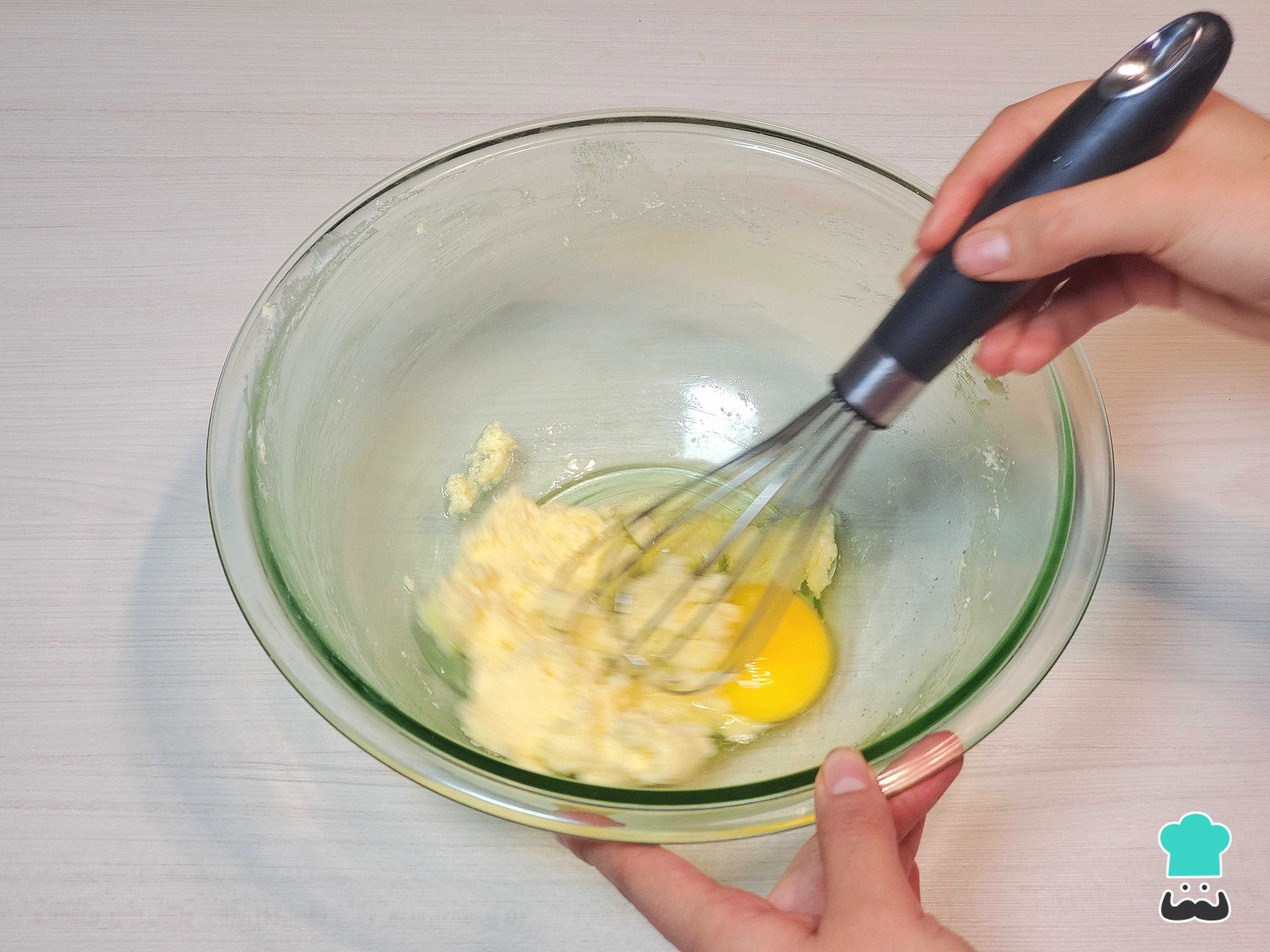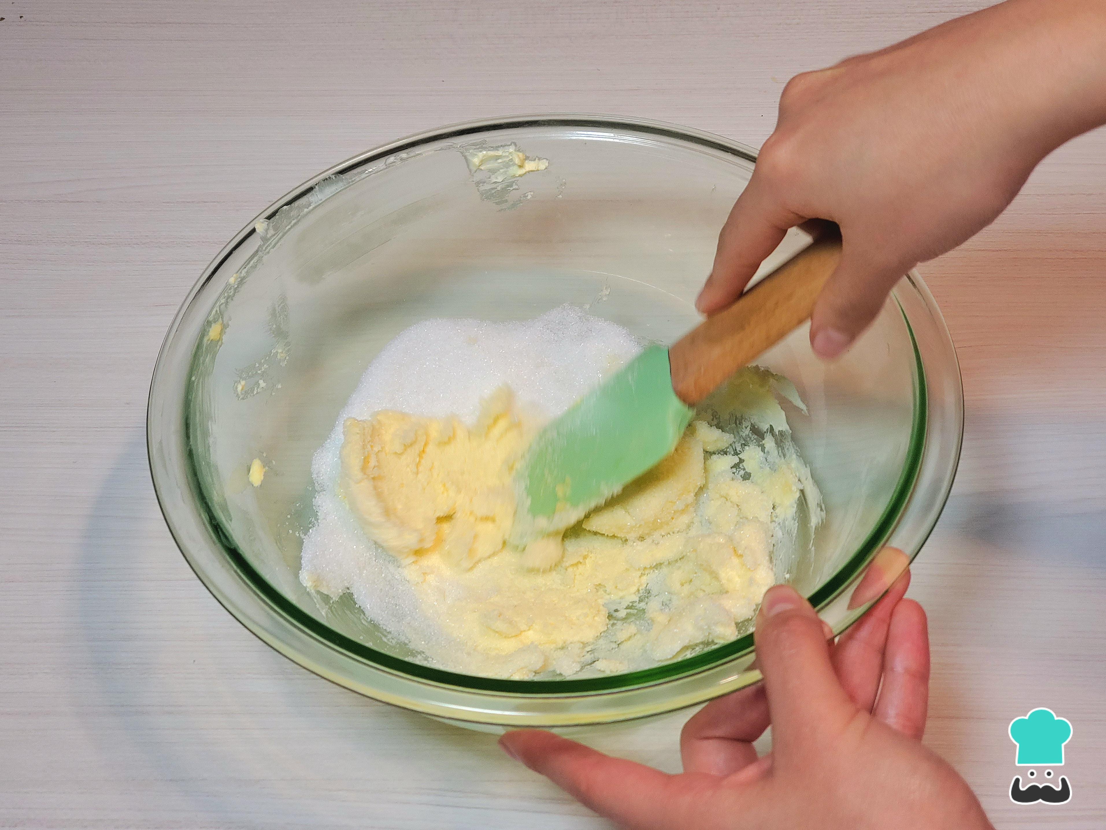 Empieza preparando la base. En un bowl, coloca la mantequilla a temperatura ambiente junto con el azúcar. Mezcla bien utilizando una espátula de goma hasta que se forme una crema untable.