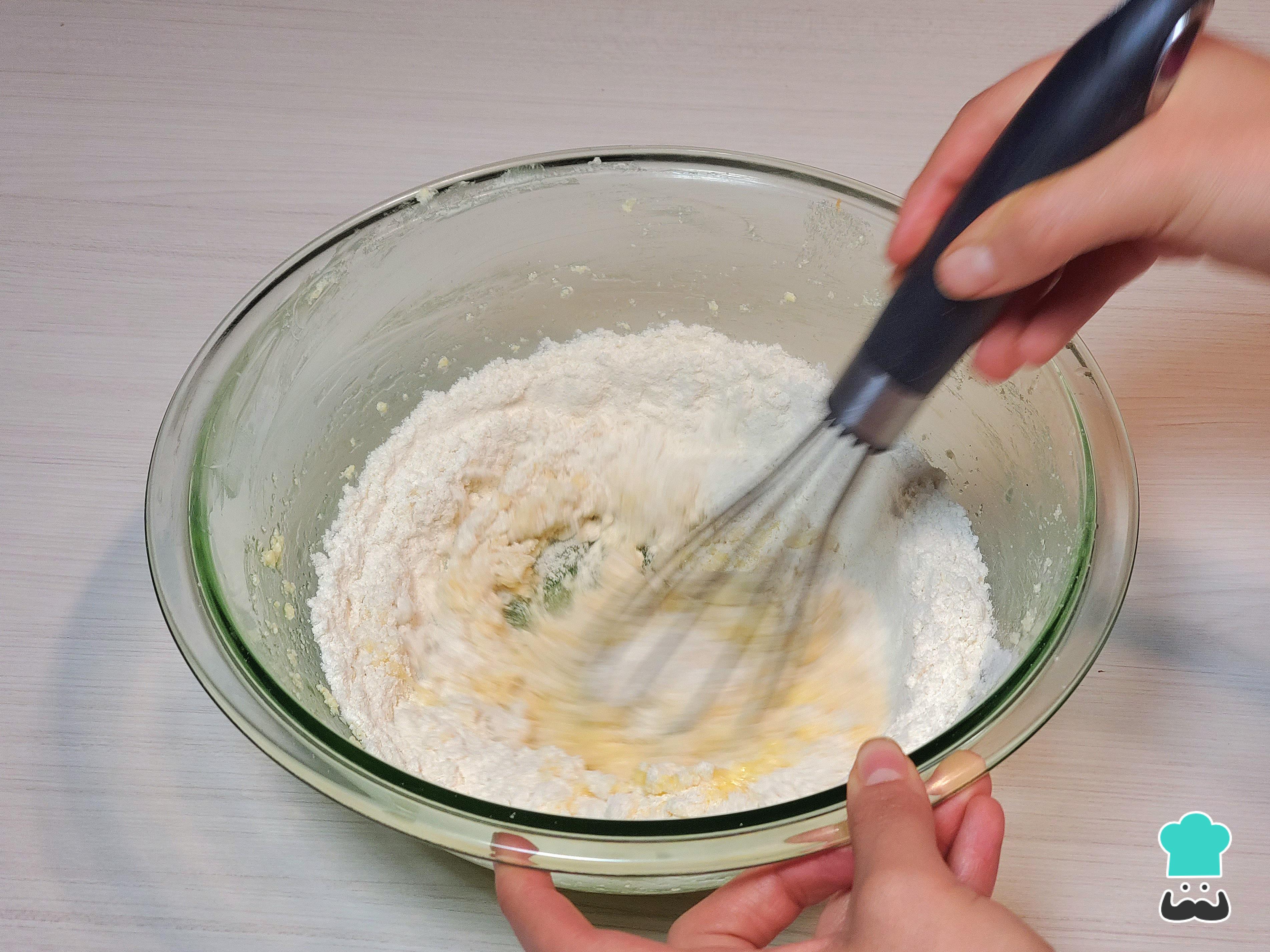 Cierne la harina, el polvo de hornear y una pizca de sal. Luego, vierte la mitad de esta mezcla en el bowl con la mantequilla y mezcla bien.