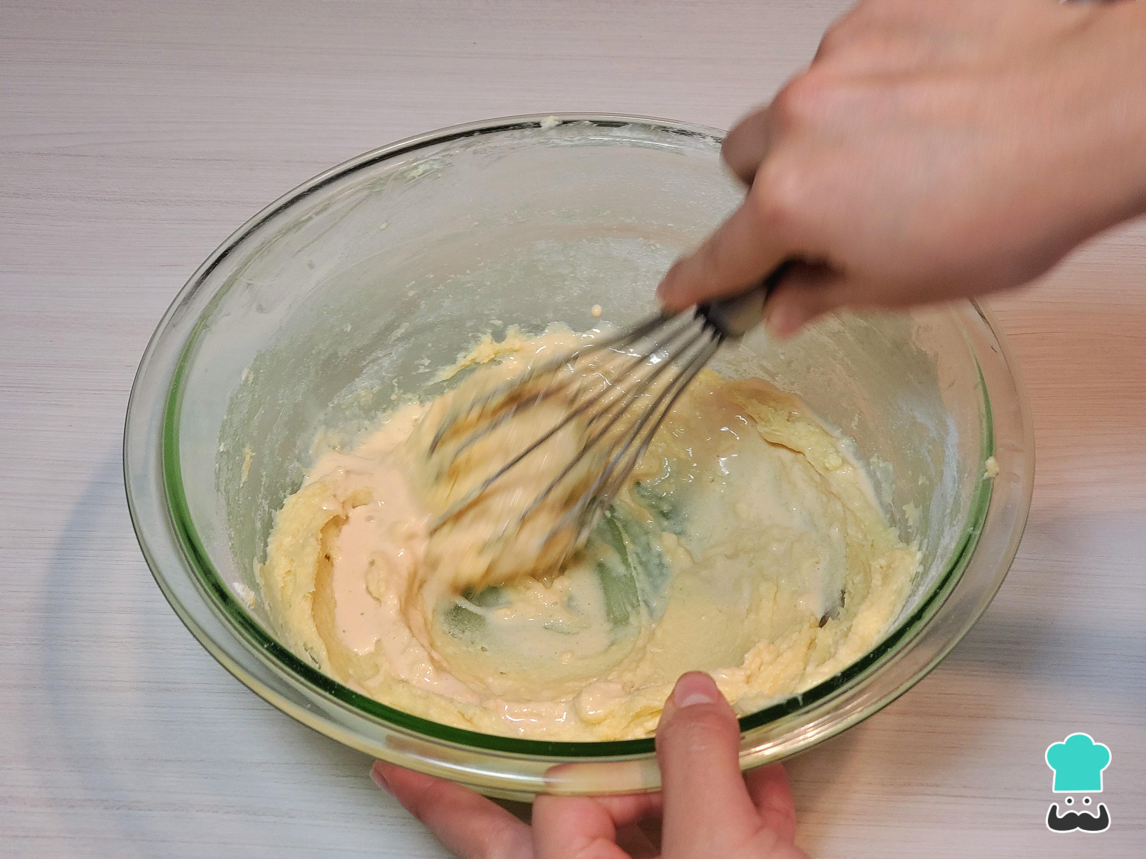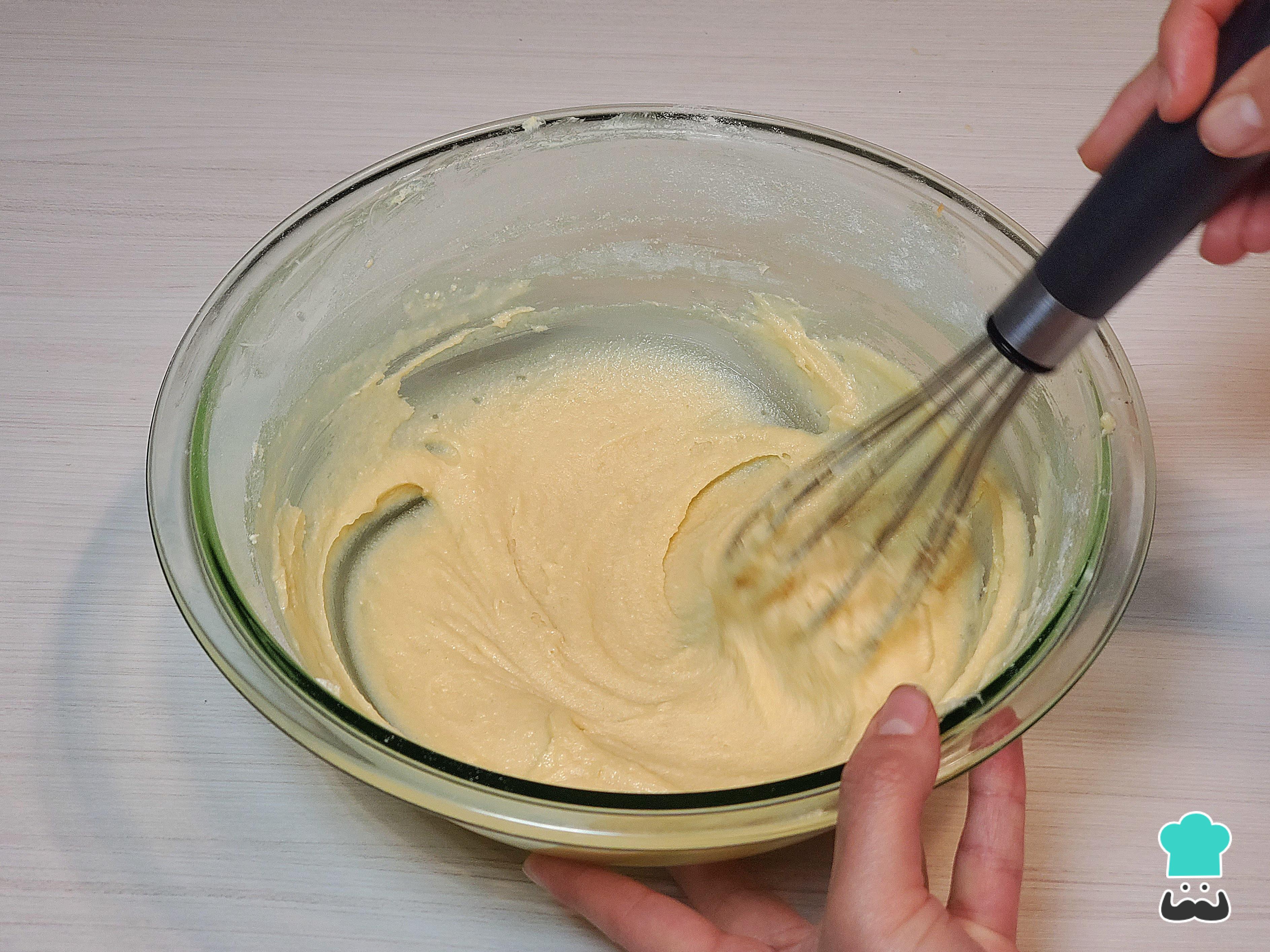 Incorpora el huevo batido poco a poco y, cada vez que añadas un poco, remueve bien para que se integre en una mezcla homogénea.