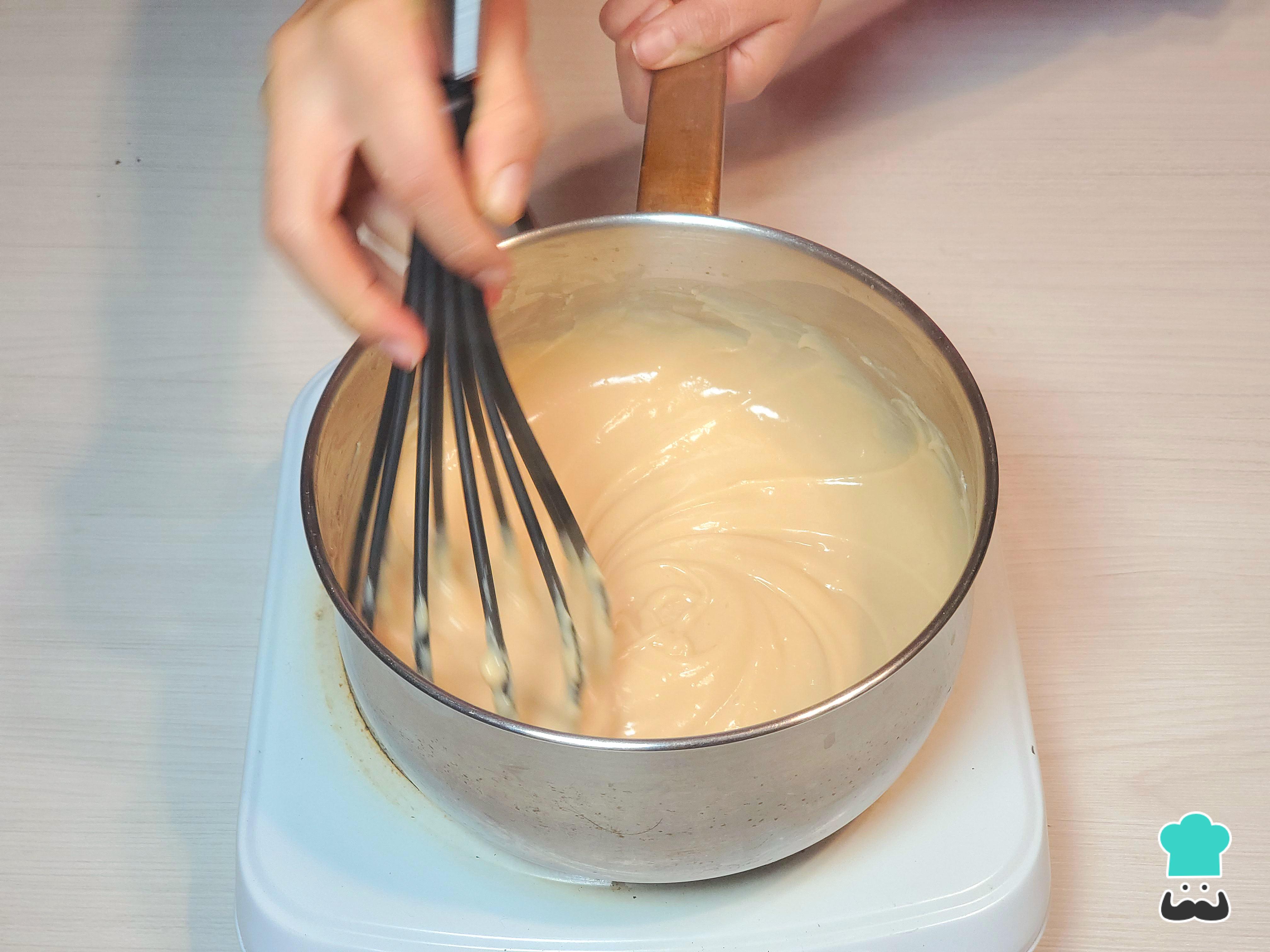 Coloca la olla sobre una hornilla y deja que se caliente hasta que rompa el hervor y espese. Durante este tiempo, asegúrate de ir removiendo constantemente para que no se formen grumos o se queme el fondo de la olla.