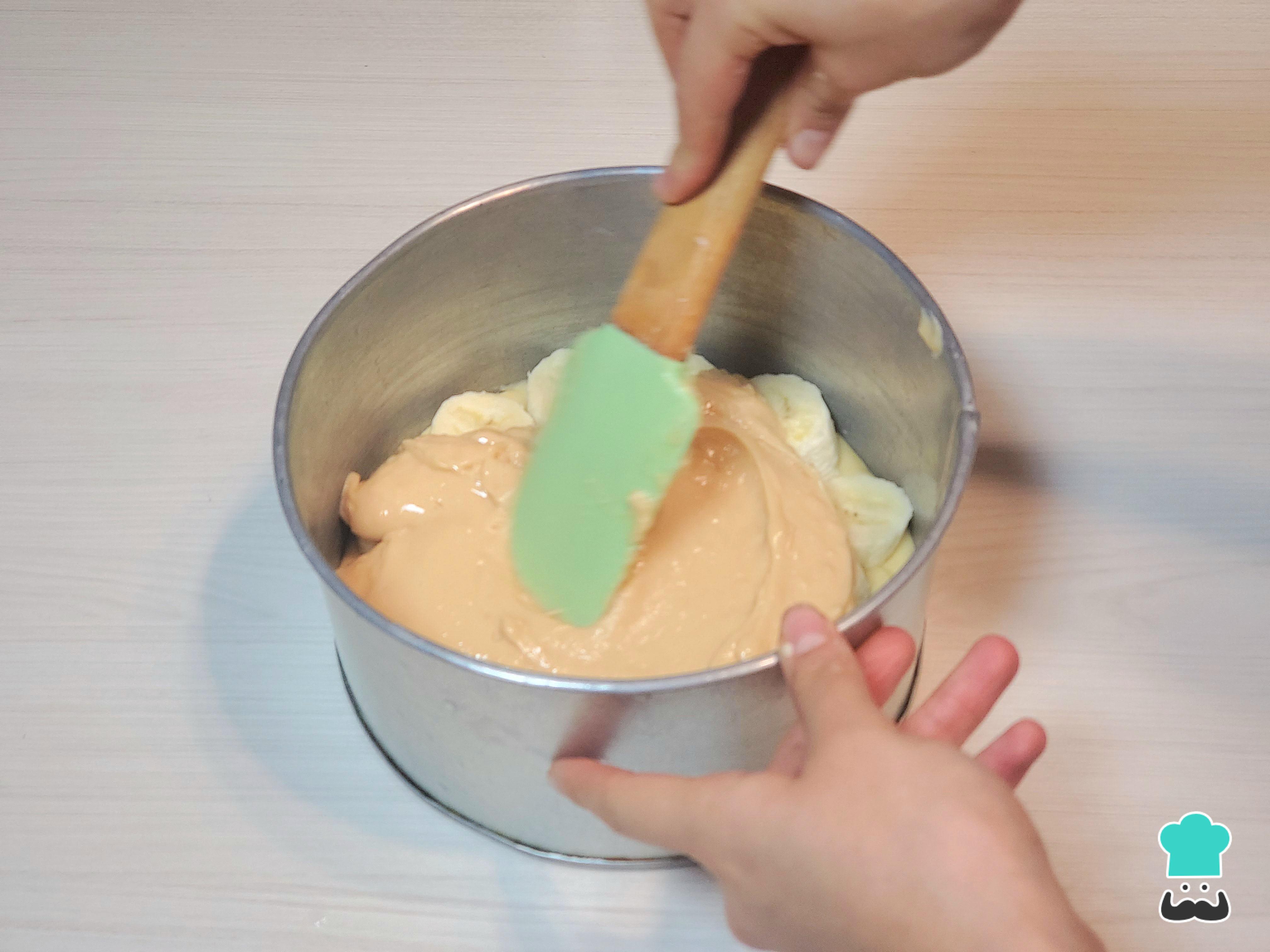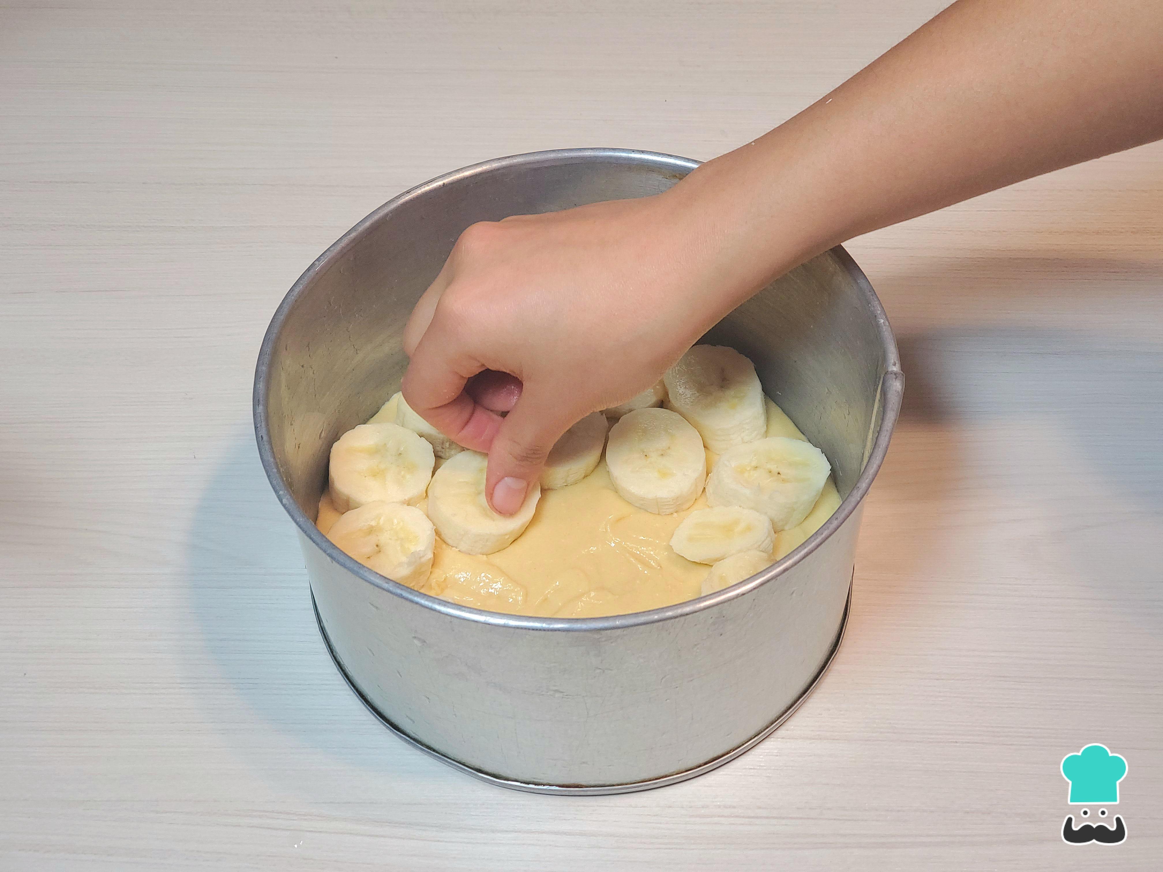 Antes de volcar esta crema en el molde, coloca unas rodajas de plátano encima de la masa.