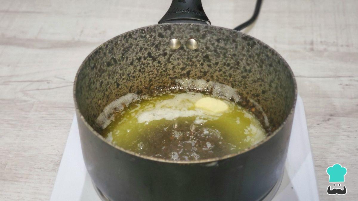 Para hacer esta bechamel, que es una de las más densas, en una olla añade la mantequilla y, a fuego medio, remueve para que se derrita sin coger color.