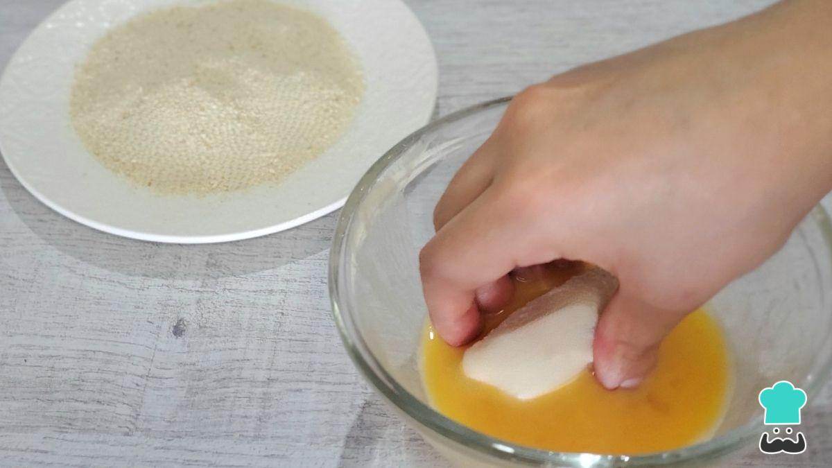 Pasa cada cubo con cuidado uno a uno por una bandeja con maicena o harina. Sacude el exceso y sumérgelos uno por uno en otra bandeja con huevo batido.