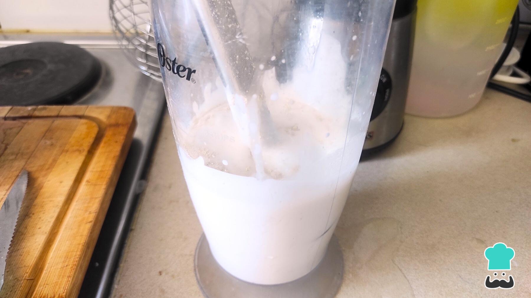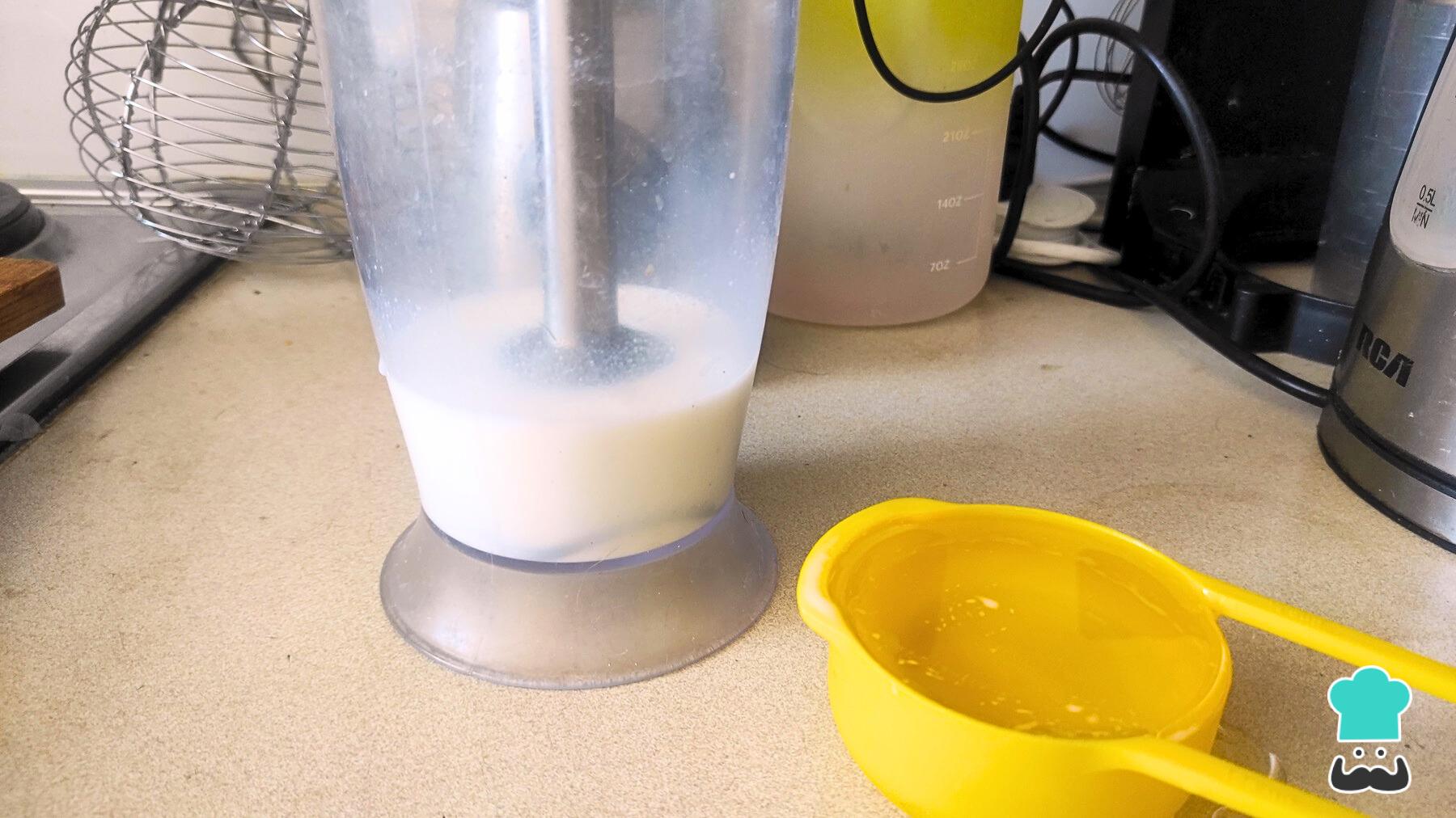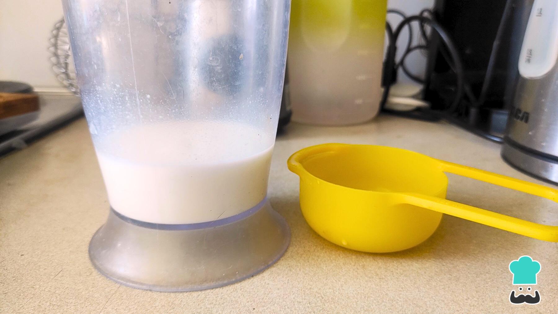 Mide una taza de leche y agrega al vaso de la mezcladora eléctrica. Es muy importante que la leche esté fría a temperatura del refrigerador.