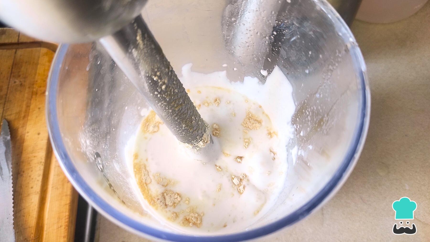 Comienza a mezclar y ve añadiendo el aceite en forma de hilo sin dejar de batir ni levantar la mezcladora.