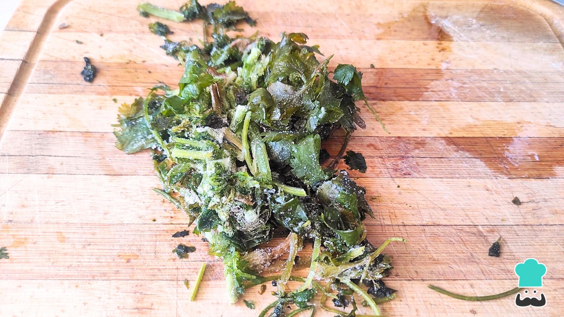 Pica el cilantro, puedes usar fresco o congelado. En este caso estamos usando cilantro congelado.