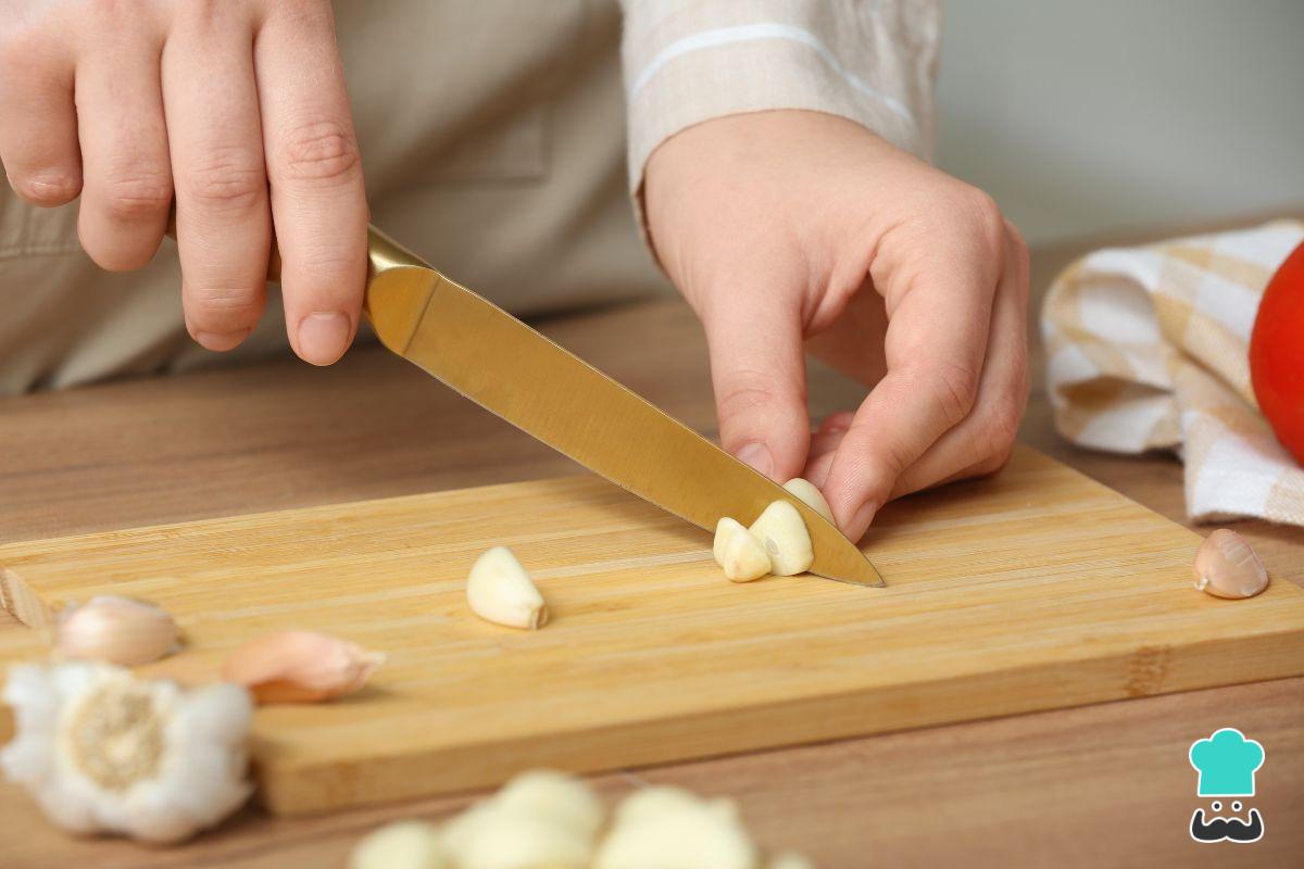 Mientras se calienta el aceite, lamina los ajos y, si quieres darle un toque picante, la guindilla o chile. Una vez laminados, incorpóralos a la sartén y deja que se doren lentamente mientras aromatizan el aceite. Esta es la base indispensable para cualquier receta de langostinos al ajillo y perejil.