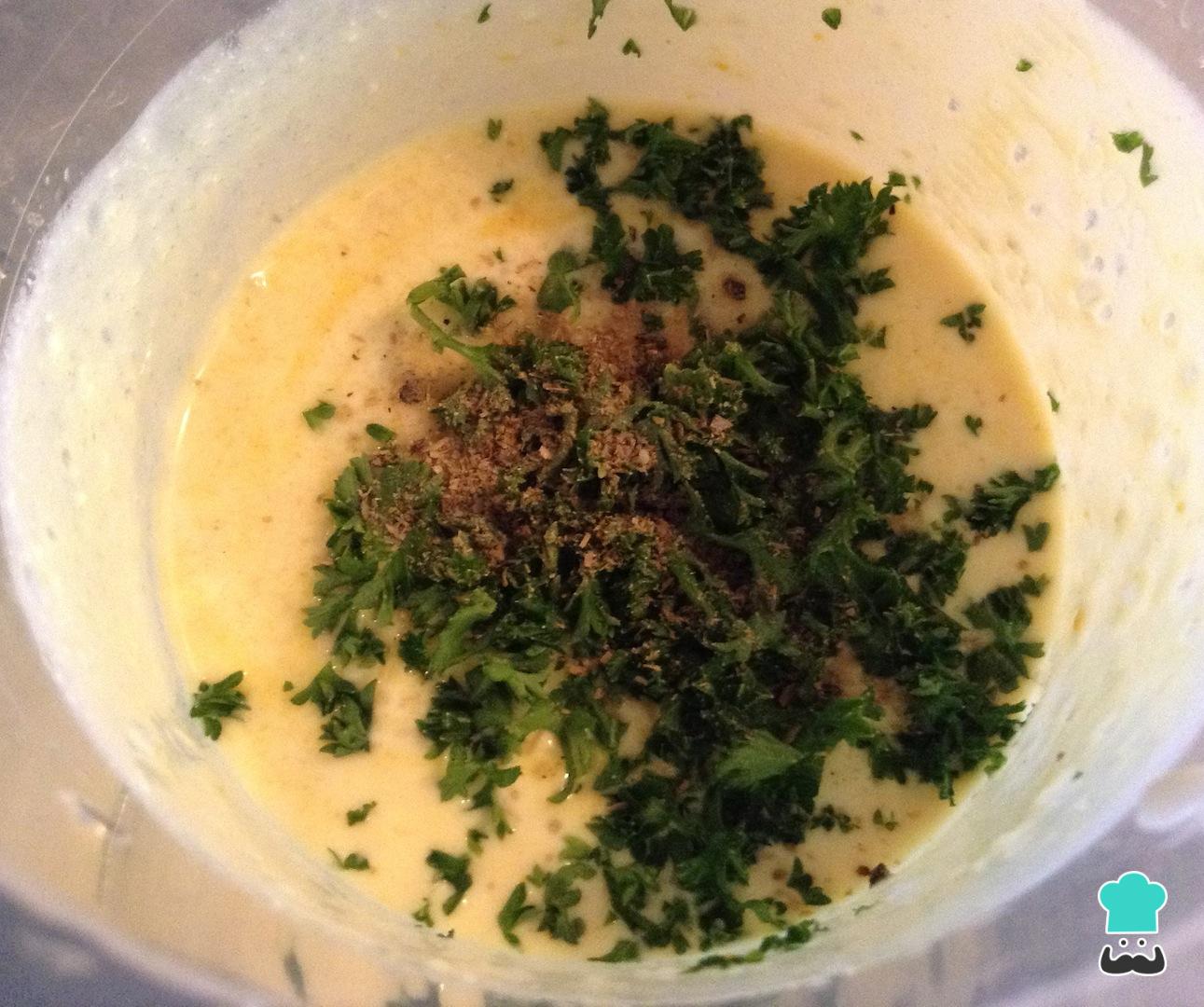 Ahora vamos a realizar la salsa base para poder llevar nuestros langostinos al horno. Para ello, coge un tazón y adiciona la crema de leche, perejil fresco, sal, pimienta, mostaza y un chorrito de Brandy. Mezcla muy bien los ingredientes.