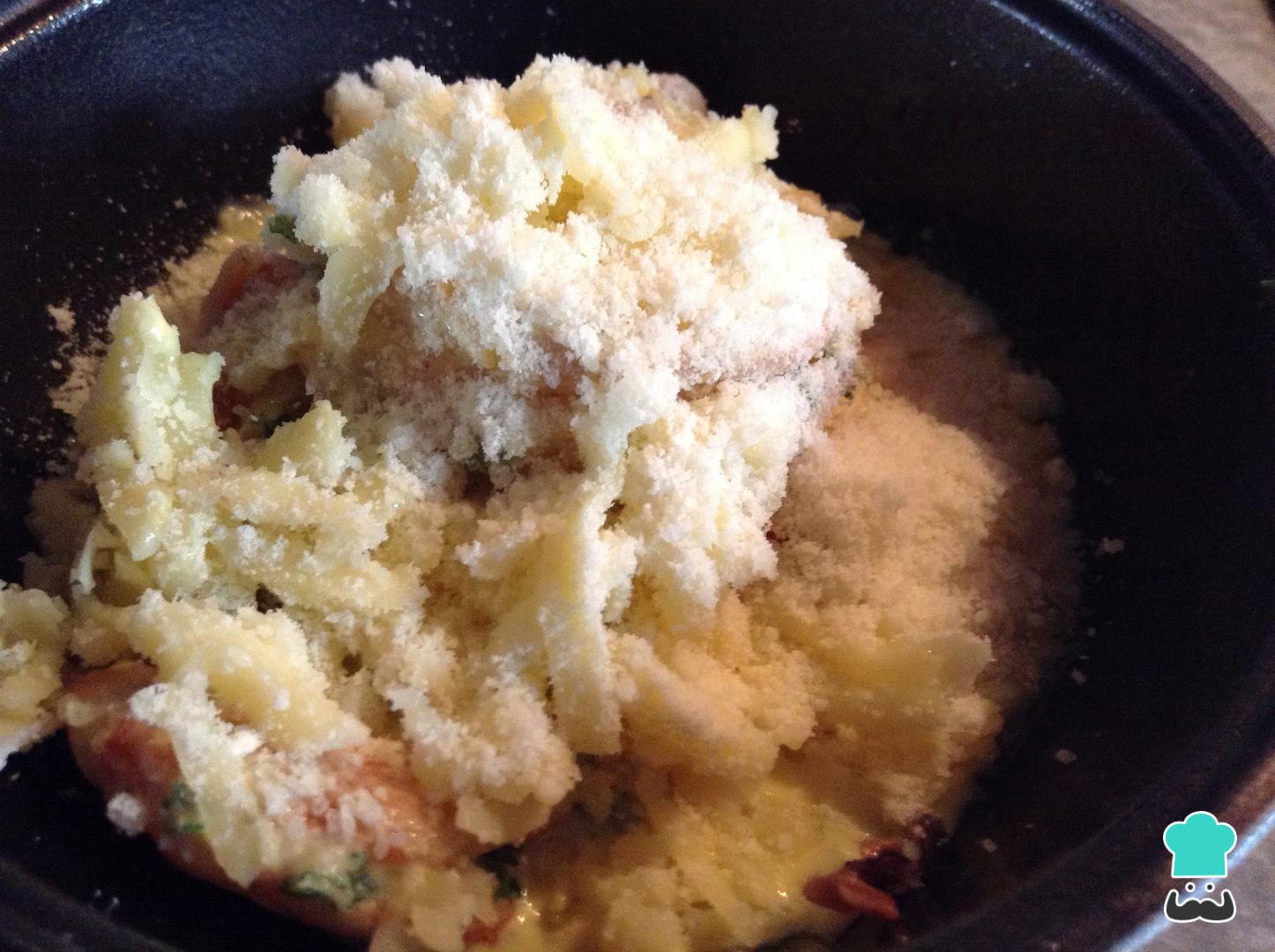 Adiciona el queso mozzarella y el queso parmesnano de manera que quede bien distribuido sobre la preparación. Precalienta el horno a 150ºC y gratina los langostinos hasta que los quesos doren.
