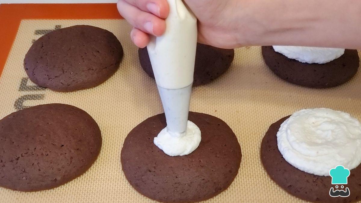 Coloca la crema encima de las galletas decorando con una manga y una boquilla lisa.