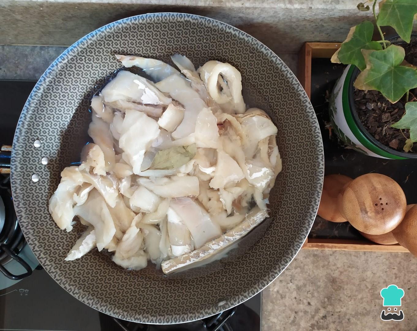 Empezamos desalinizando y cociendo el bacalao. A continuación, colócalo en una cacerola con abundante agua, añade al fuego y, cuando empiece a hervir, déjalo cocer durante 15 minutos aproximadamente. Luego, tira el agua, lava el bacalao y desmenuza en trozos grandes.