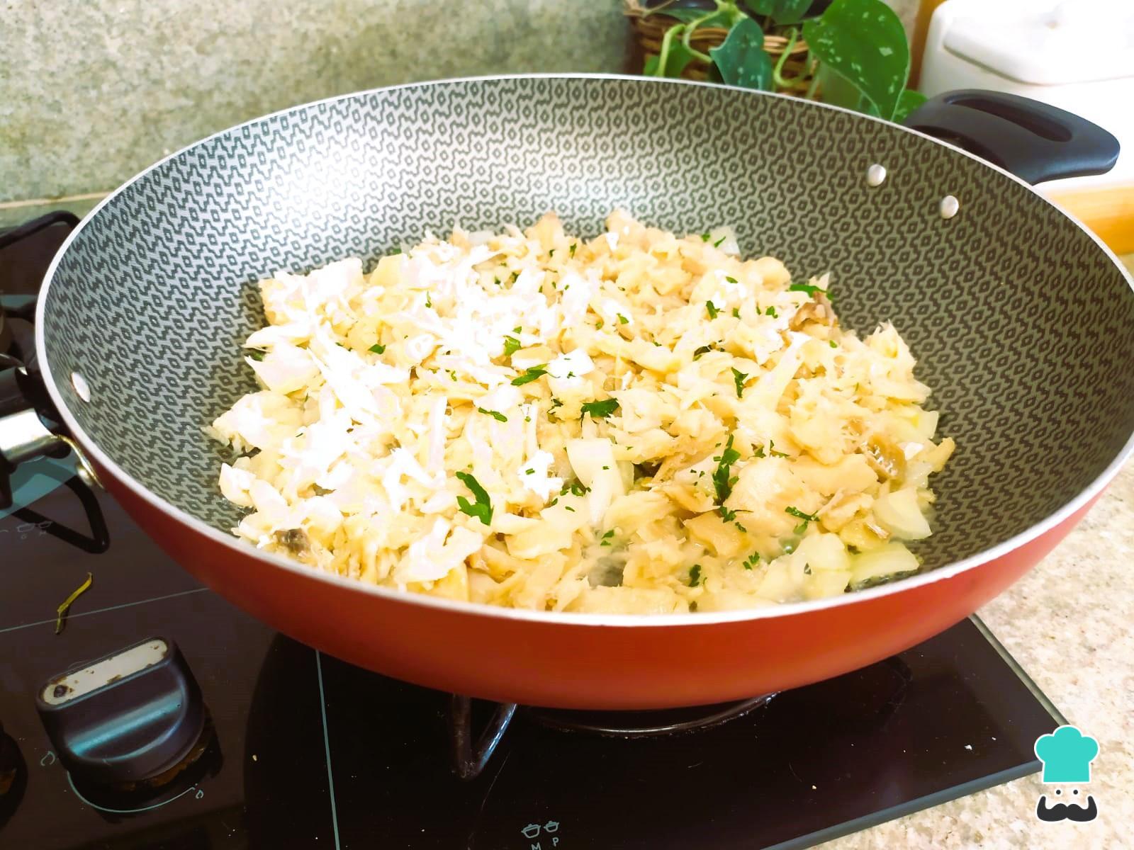En otra sartén calienta un chorrito de aceite de oliva, sofríe la cebolla y el ajo hasta que estén dorados. Luego, añade el bacalao desmenuzado y sofríe bien. Apaga el fuego y añade la guindilla verde picada, reserva.