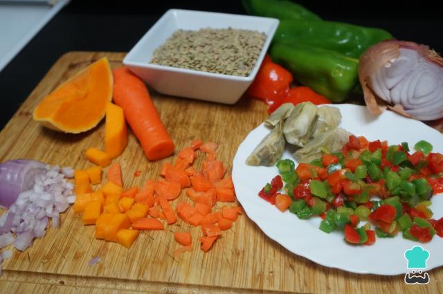 Lava las lentejas y las verduras. Pica el pimiento verde, el pimiento rojo y la cebolla en trozos pequeños. En cuanto a la calabaza, pélala y córtala en cubos medianos. Puedes cortar la zanahoria en rodajas o cubitos pequeños. Limpia las alcachofas, quita todas las hojas de fuera y corta el centro en cuartos.