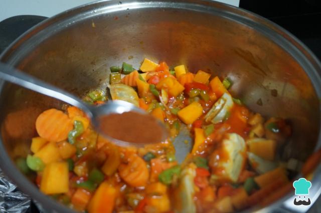 Pon una cazuela con 3 cucharas de aceite. Añade la cebolla, déjala unos 3 minutos y agrega el resto de las verduras. Deja cocinar mientras remueves por unos 5 minutos. Añade las cucharadas de tomate frito, remueve y añade la cucharada de pimentón dulce. Mezcla bien.