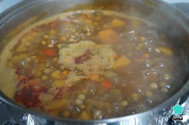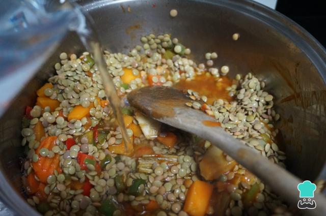 Añade las lentejas lavadas y cubre con abundante agua, todos los ingredientes deben quedar bien cubiertos y sumergidos. Deja cocinando unos 30 minutos.