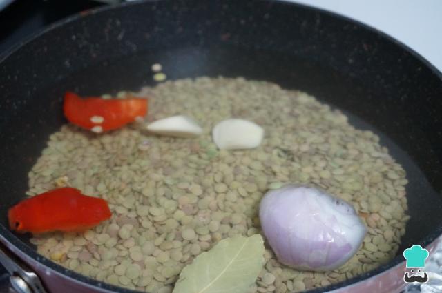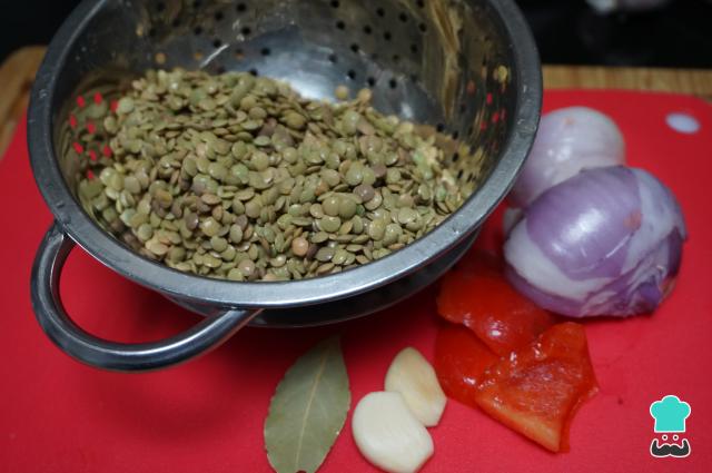 Lava bien las lentejas bajo el grifo. Aparte, prepara las verduras. Para ello, pela la cebolla y córtala por la mitad o en cuartos, el pimiento córtalo por la mitad, pela los dientes de ajo pero déjalos enteros.