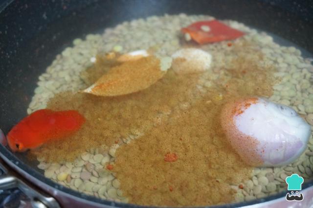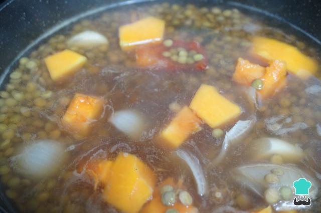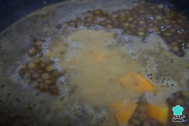 Cuando las lentejas alcancen la mitad de la cocción, aproximadamente unos 20 minutos, incorpora los trozos de calabaza, añade un poco de sal y deja cocinar hasta que quede la calabaza y las lentejas tiernas.