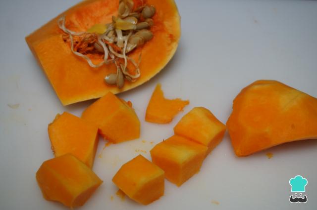 Pela y corta la calabaza, la cantidad será toda la que se quiera poner al guiso. Córtala en trozos como si fueran patatas.