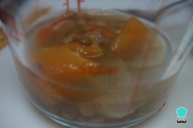 Cuando ya estén las lentejas, si quieres queden más suaves y sin pedazos, coge las verduras, colócalas en un bol junto con algunos trozos de calabaza y un poquito de caldo y tritura. Esto dará más sabor y espesor a las lentejas con calabaza.
