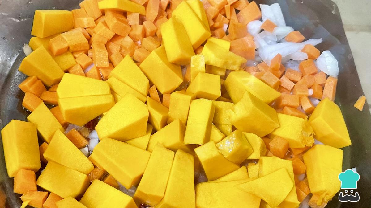 Lava, pela y corta la zanahoria, media cebolla y la auyama en trozos pequeños.