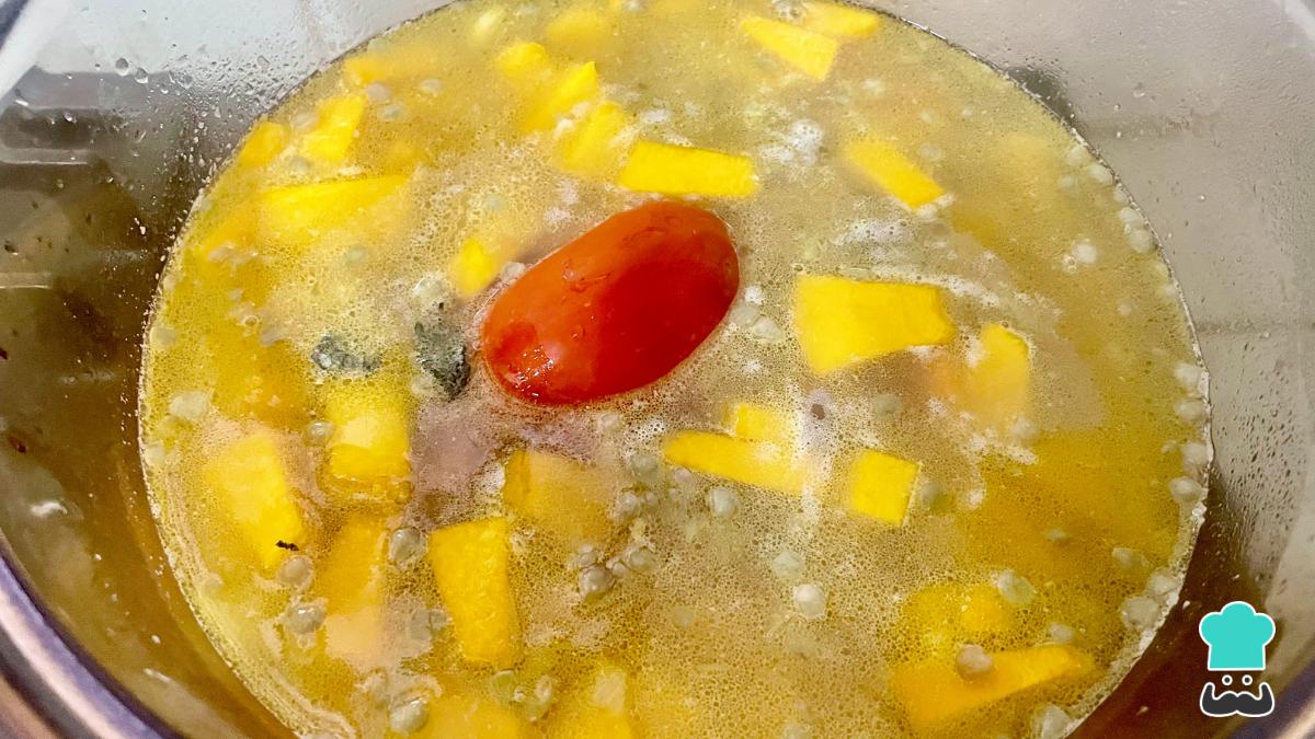 Agrega 3 tazas de agua, el tomate previamente lavado, la hoja de laurel y cocina a fuego medio.