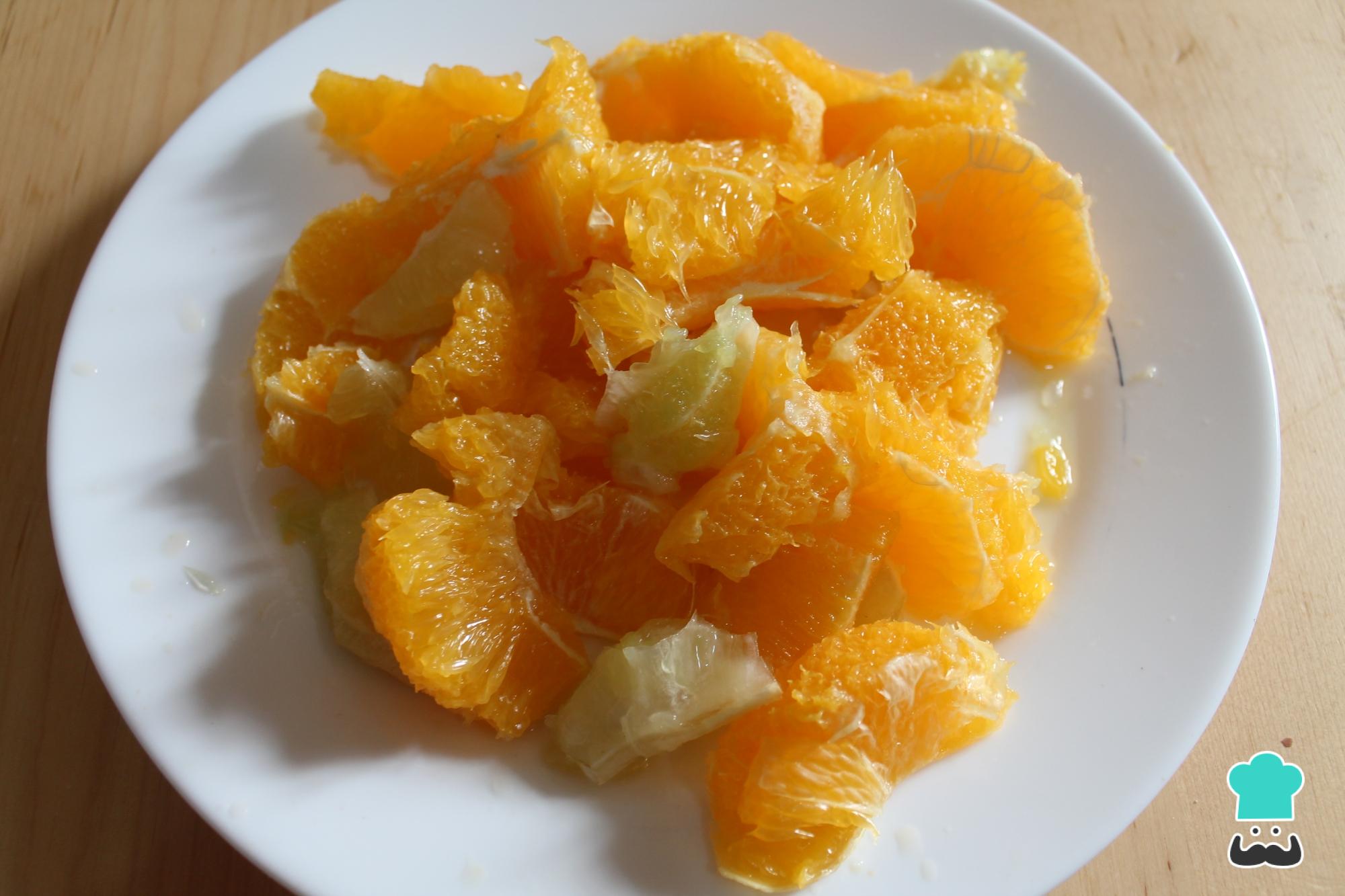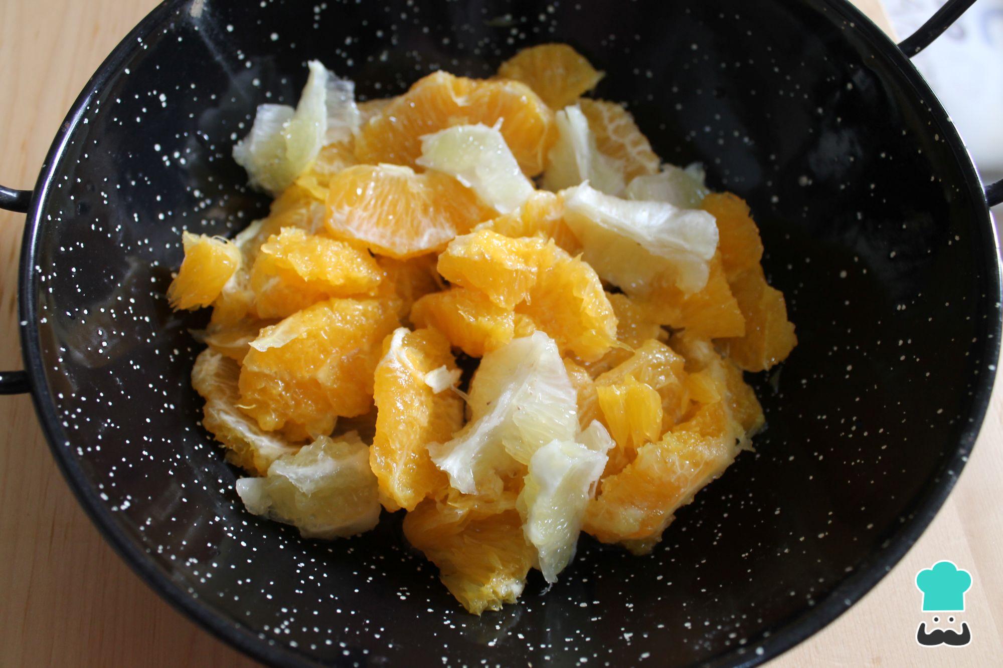 Corta a gajos tanto las naranjas como los limones, recogiendo los jugos que vayan soltando los cítricos. Reserva los gajos en otro plato hasta el momento del montaje.