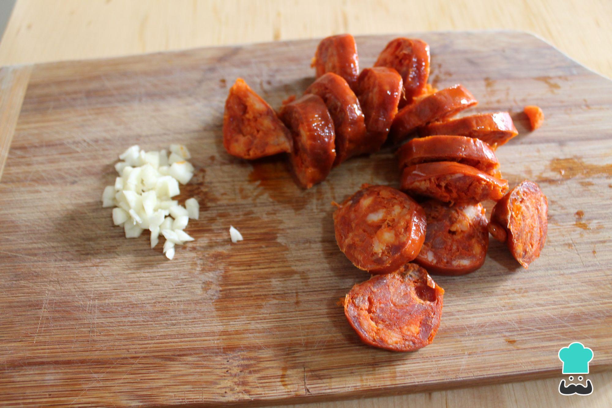 Pela el diente de ajo, pícalo y trocea. Cortatambién en lonchas no muy gruesas el chorizo.