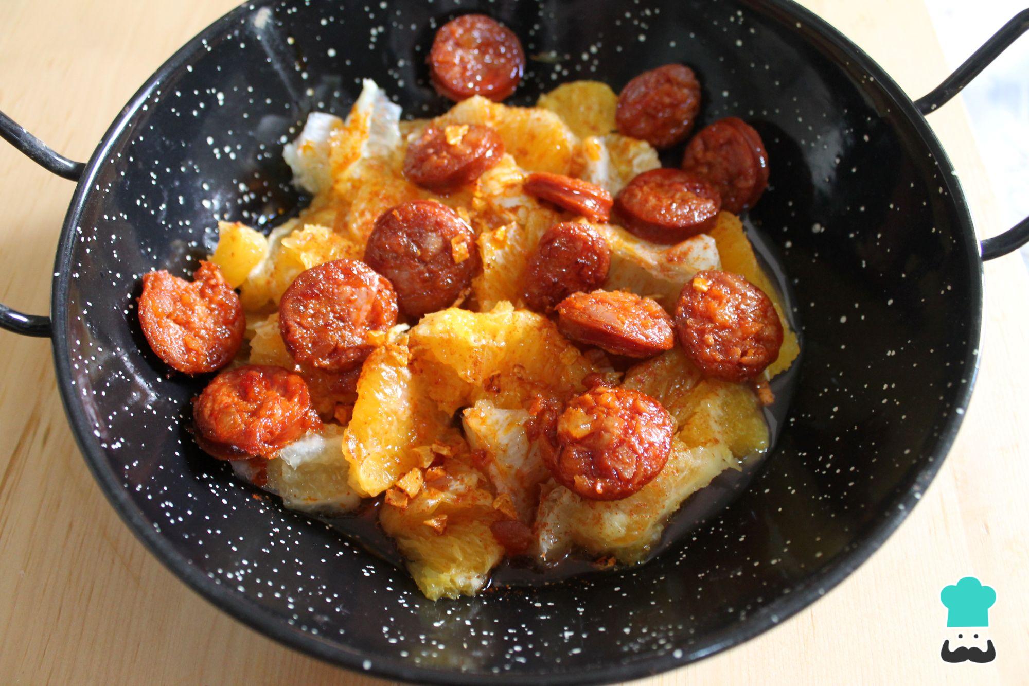 Coloca encima de los gajos de cítricos el ajo y el chorizo salteado.