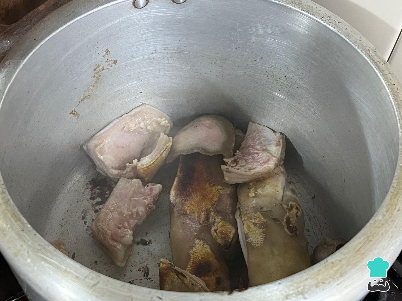 Cuando tengas tus porotos y maíz listos, comienza con la cocción del locro. Para ello, calienta la olla a presión a fuego máximo. Alcanzada la temperatura, agrega el cuero y las patitas para que comiencen a desgrasarse y aporten un fondo de cocción sabroso para tu guiso. Si deseas comer el cuero, recomendamos cortarlo en cubos de 5x5. Cuando estén dorados y derretidos, retíralos para poder dorar la carne. Retírala cuando esté dorada y resérvala.