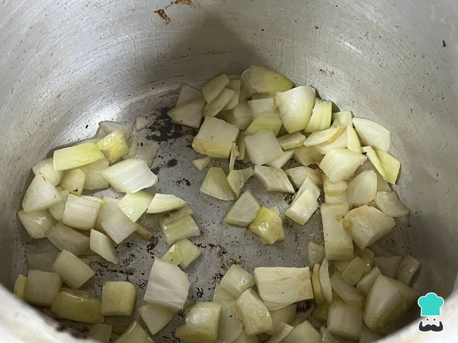 Una vez que el cuero, las patitas y la carne están doradas, agrega primero la cebolla blanca, pelada y cortada en cubos no muy pequeños. Si se secó el fondo de cocción, puedes añadir previamente algún cuerito para volver a formarlo. Una vez dorada, incorpora la parte blanca de la cebolla de verdeo.