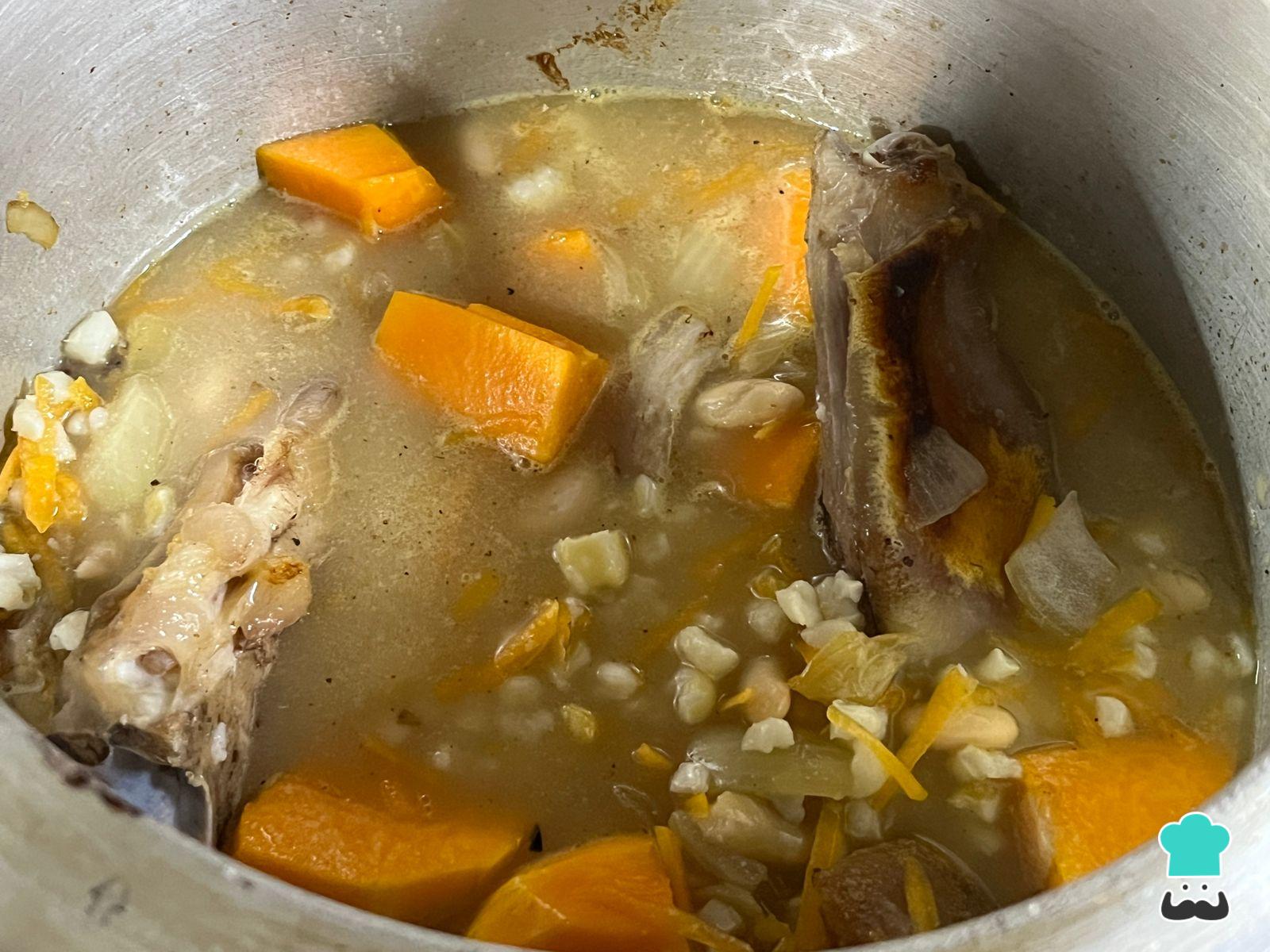 Cuando las cebollas estén tiernas y cocidas, agrega la carne que habías dorado previamente, junto con los cueritos, las patitas, el maíz, los porotos y el zapallo. Recomendamos rallar una mitad del zapallo y cortar la otra en cubos para tener dos consistencias distintas. Procura pelarlo previamente. Condimenta a gusto con comino, tomillo, ají molido y pimentón. Cubre con agua o caldo y cierra la olla a presión. Una vez que comience a sonar el silbato, baja el fuego a mínimo y cocina tu locro 25 de mayo por 1 hora.