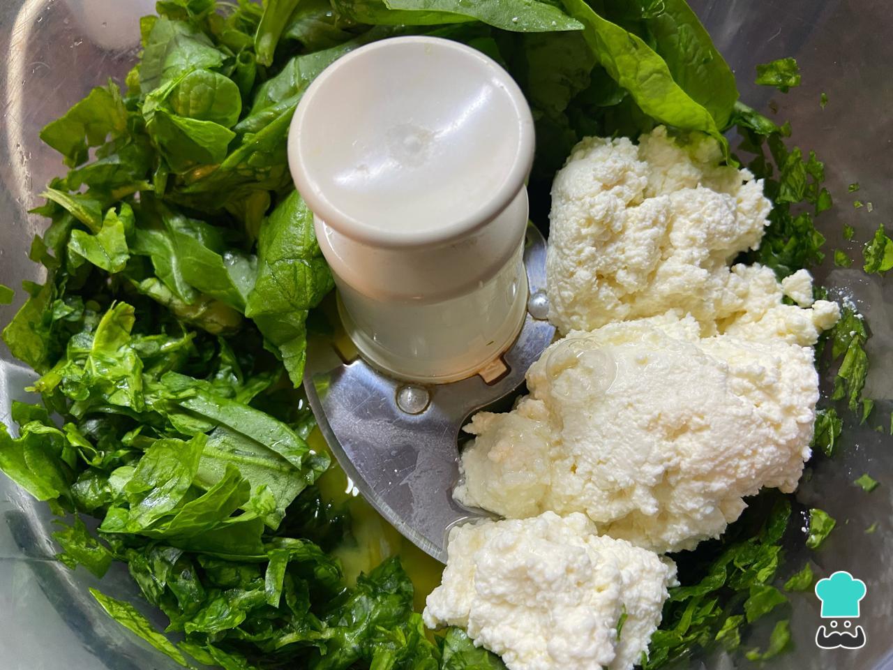 Retira los tallos o pencas de las hojas de acelga y lávalas muy bien. Después, sécalas perfectamente (puedes valerte de un centrifugador de cocina para eliminar toda el agua que les pueda quedar del lavado). Rompe un poco las hojas y ponlas en el vaso de un procesador junto con la ricota y el huevo.